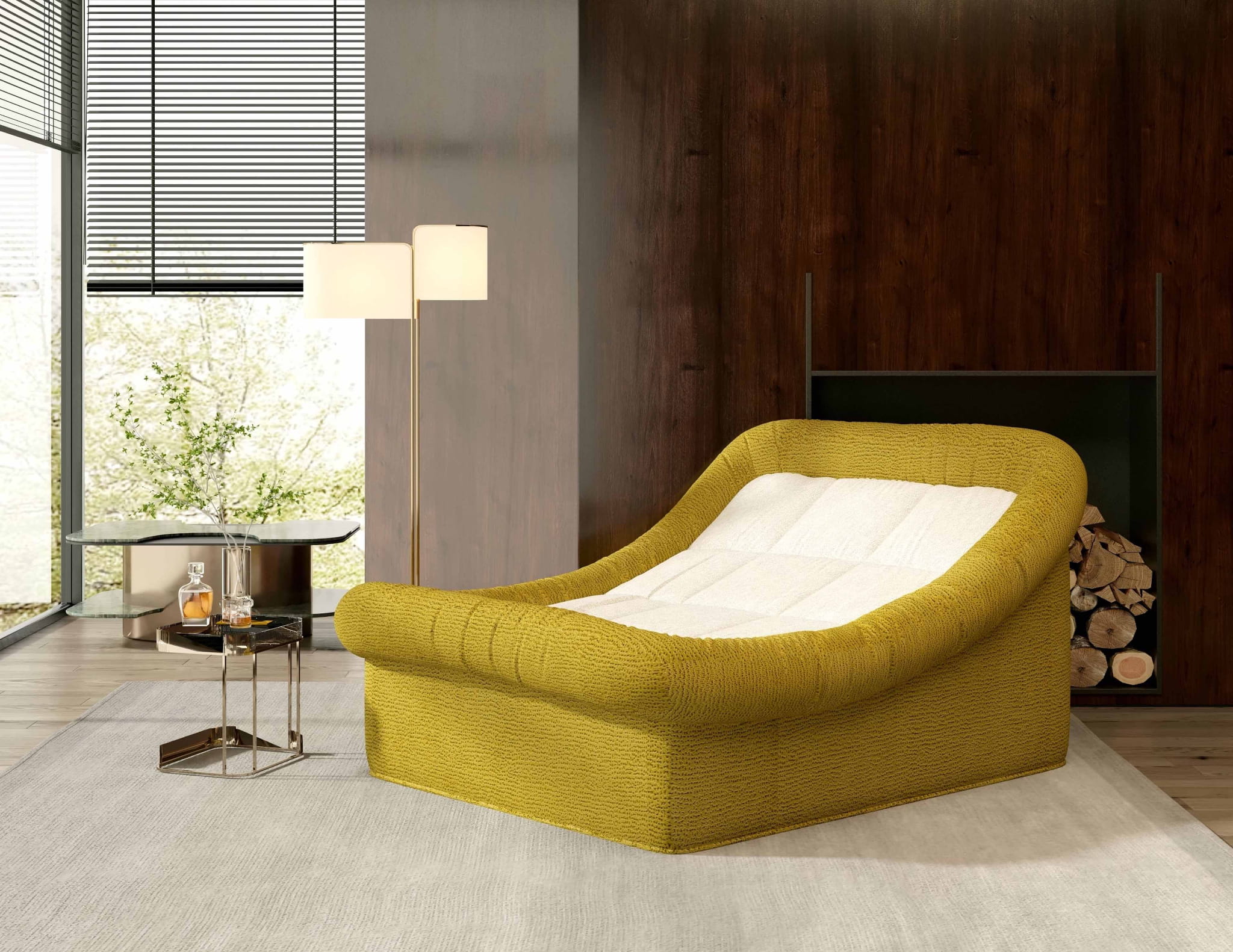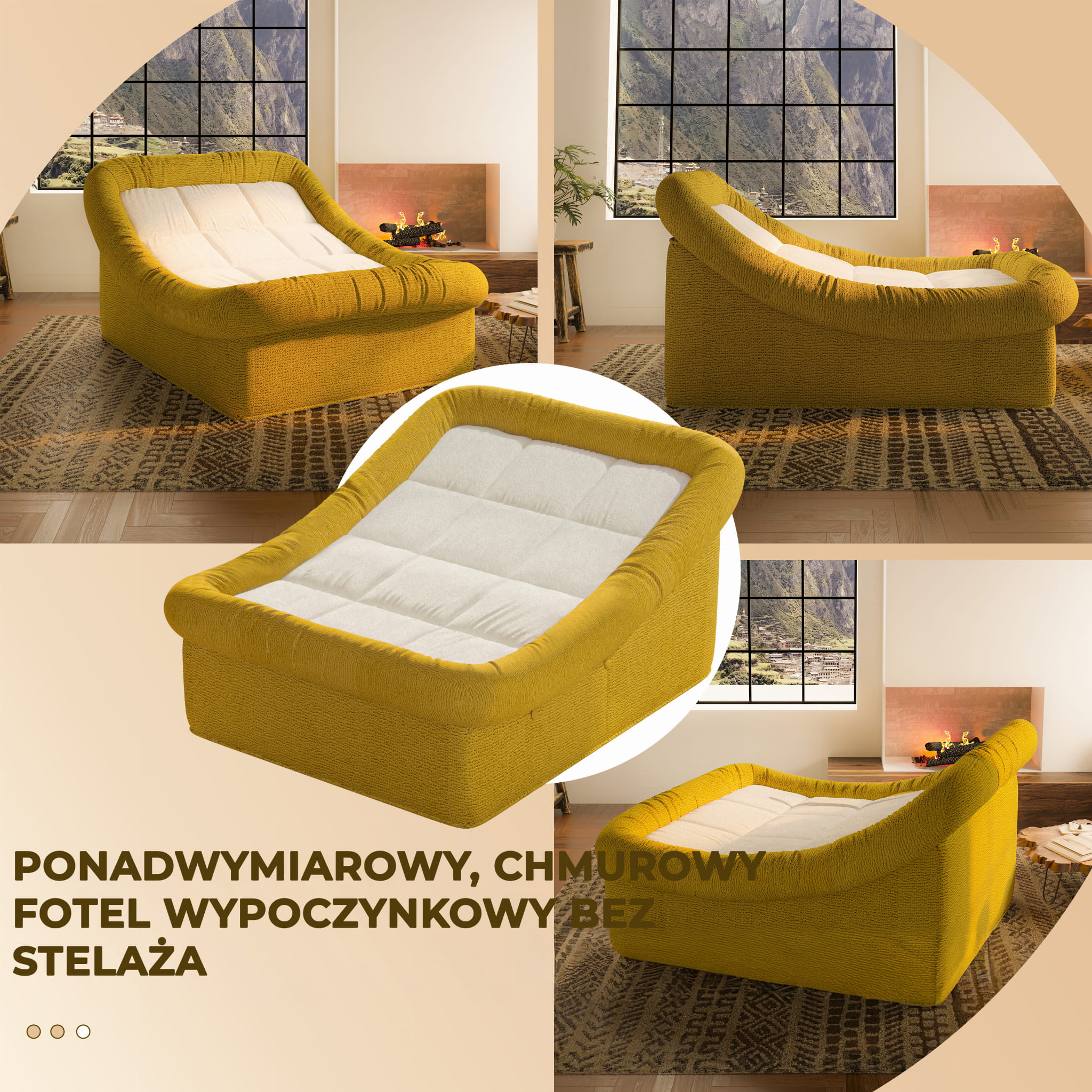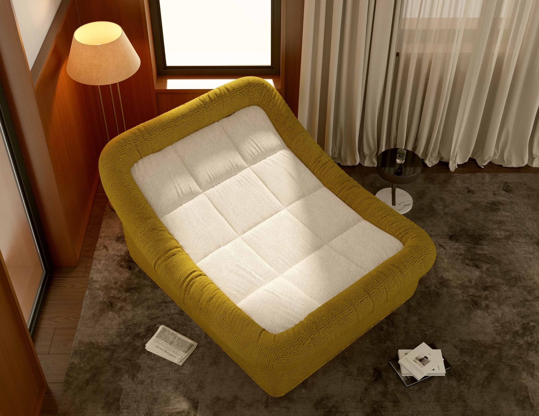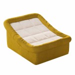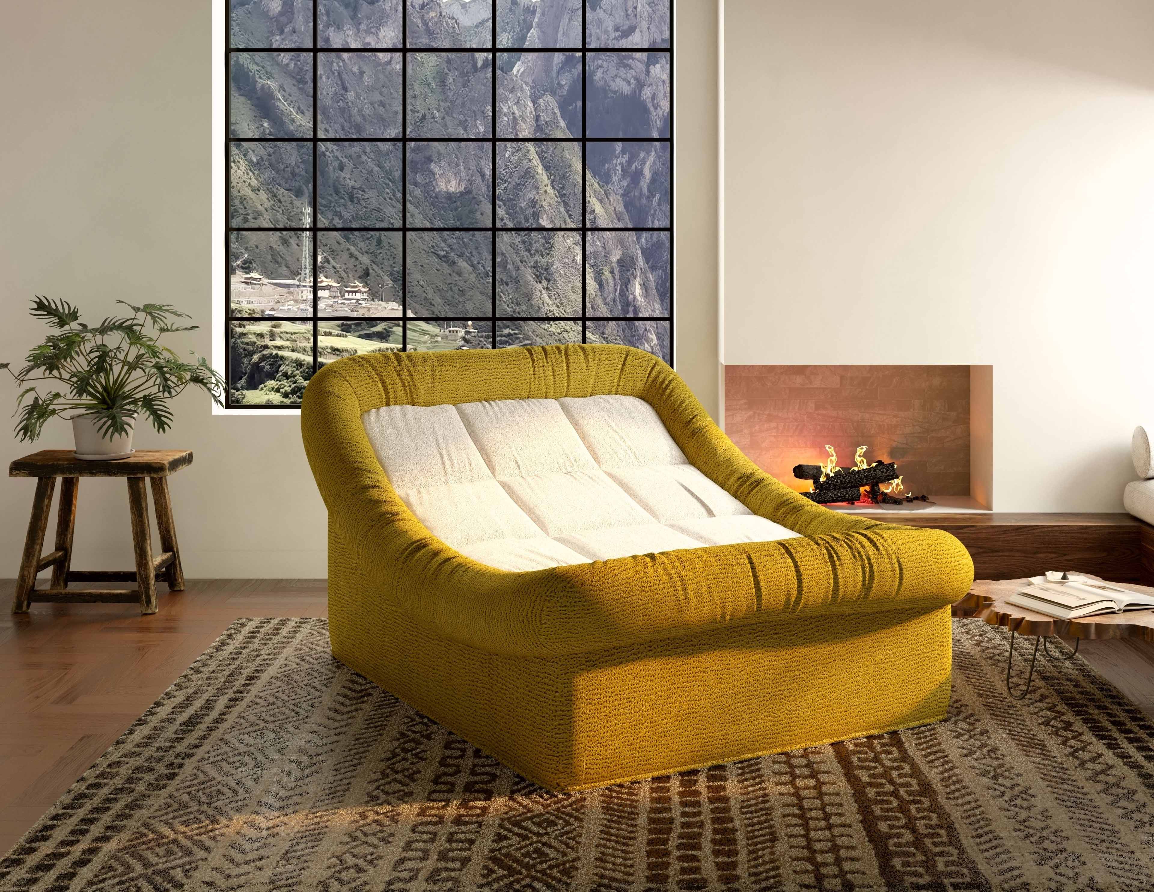 Leżanka wyróżnia się odważną, a jednocześnie przytulną bryłą. Połączenie nasyconej, miodowej żółci z delikatną, kremową bielą siedziska tworzy harmonijny kontrast, który ociepli każde wnętrze – od surowych loftów po eleganckie salony w stylu skandynawskim. Miękkie, zaokrąglone krawędzie i charakterystyczne pikowanie nadają jej unikalnego, organicznego charakteru.