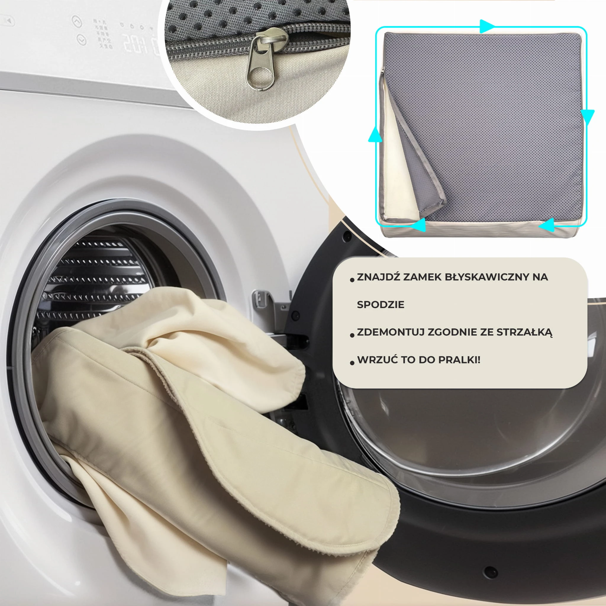 Utrzymanie czystości jest niezwykle proste. Pokrowiec jest w pełni zdejmowany dzięki zamkowi błyskawicznemu znajdującemu się na spodzie. Wystarczy go odpiąć, zdjąć i wrzucić do pralki!