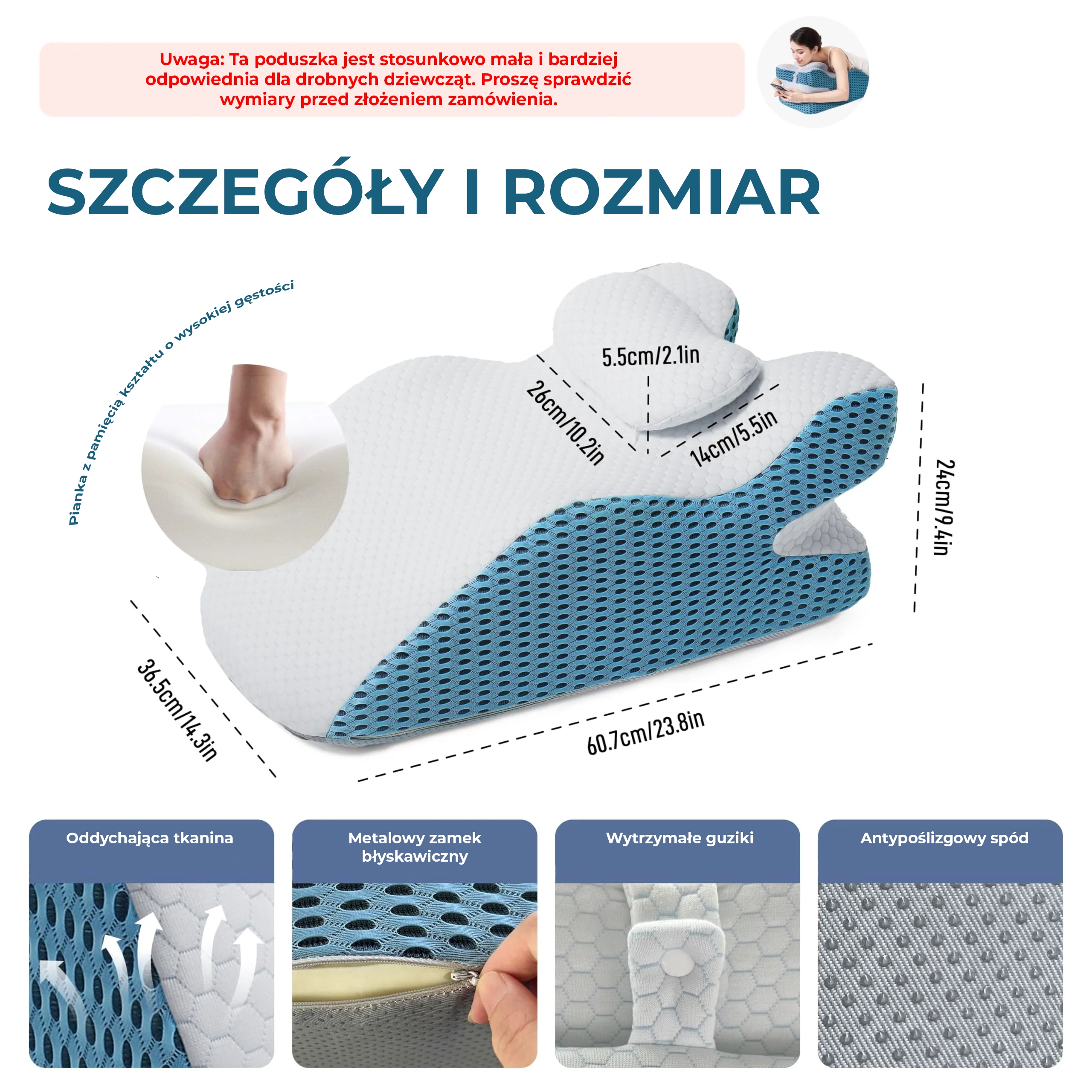 Ta wszechstronna poduszka oferuje kompleksowe wsparcie dla karku, pleców, talii i nóg. Może być używana jako: