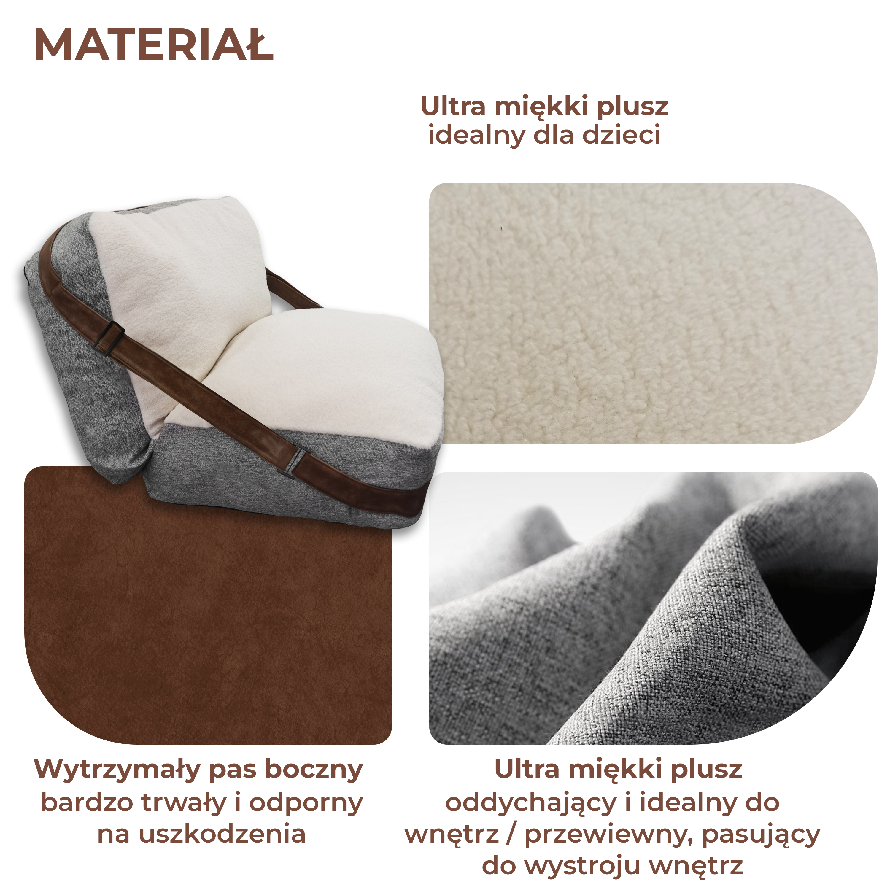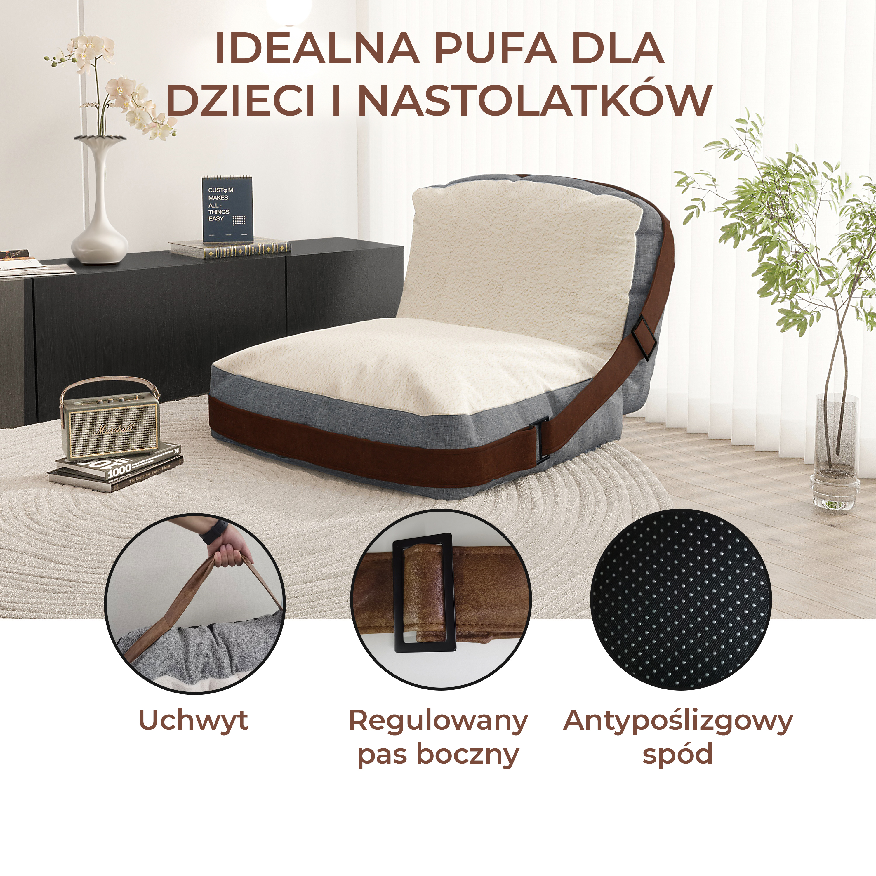 Ten ultra wygodny puf z wysokiej jakości pluszu i tkaniny lnianej to ulubione miejsce na relaks i zabawę. Posiada antypoślizgowy spód, który gwarantuje stabilność, oraz regulowany pas boczny, który zapewnia wygodne podparcie. Dzięki solidnemu uchwytowi, puf można łatwo przenosić. To trwały i bezpieczny mebel, idealny do gier wideo, czytania i odpoczynku w każdym pokoju.