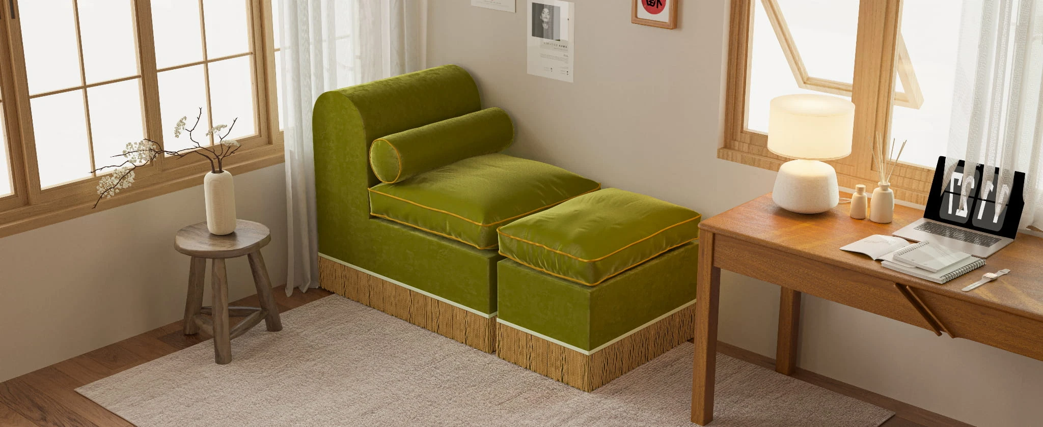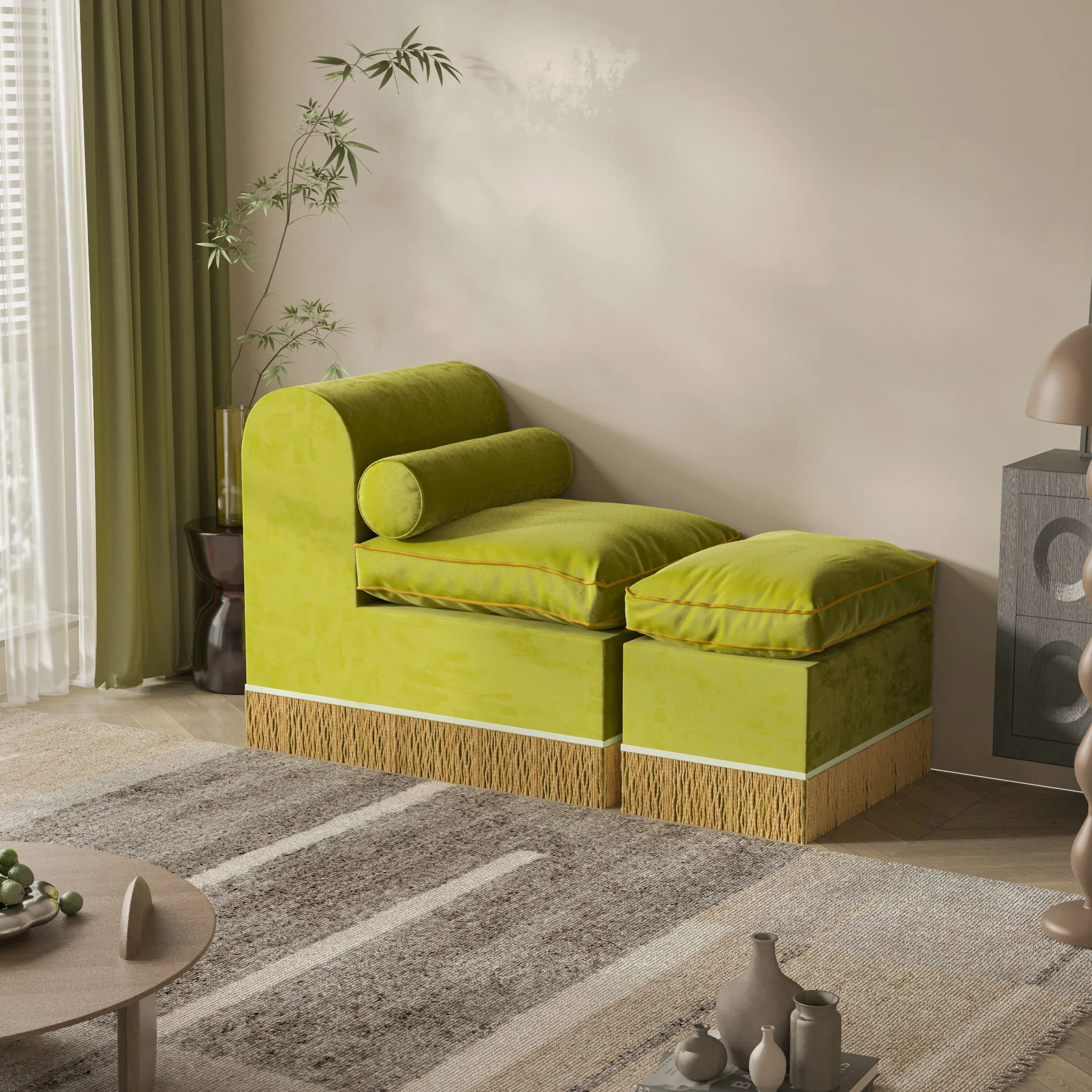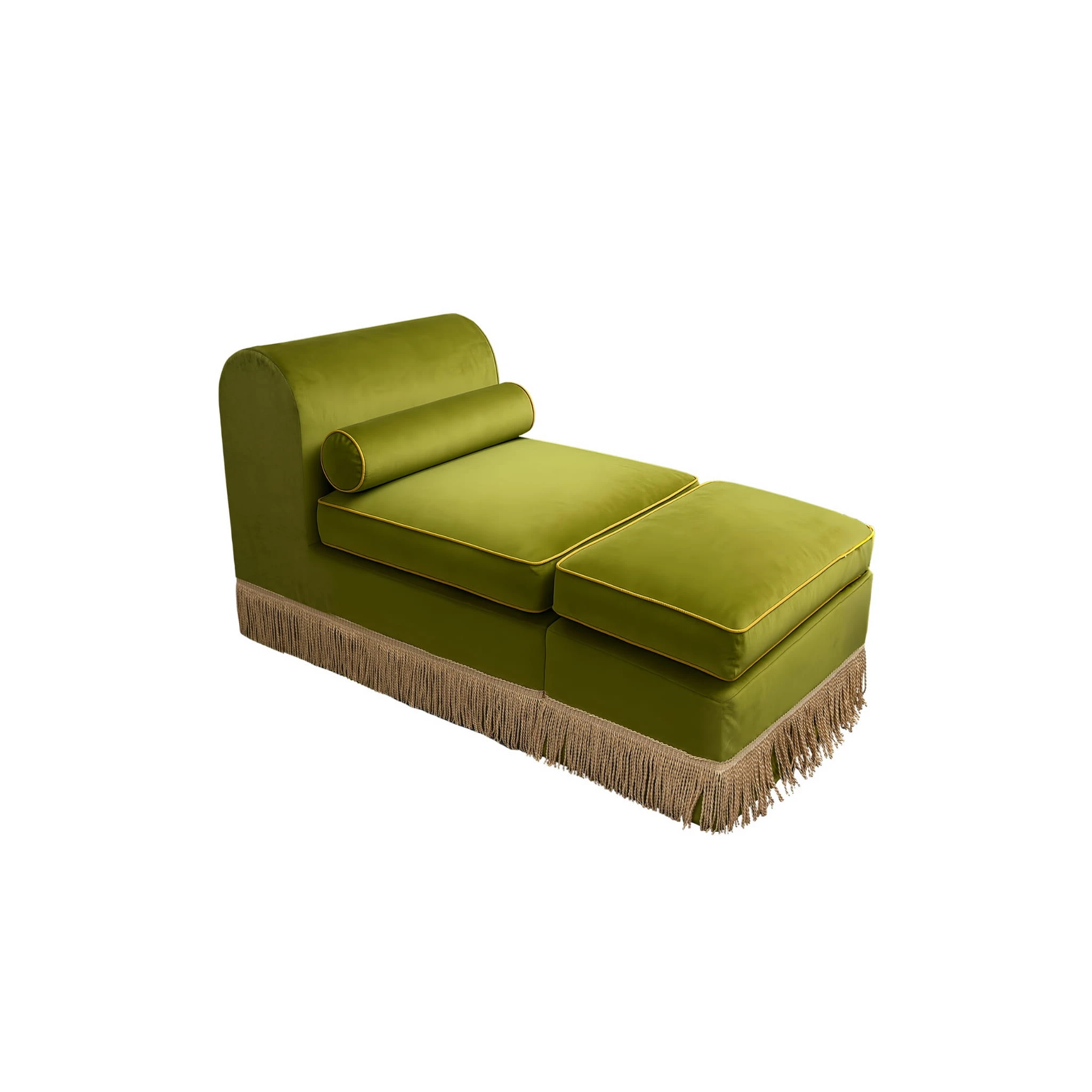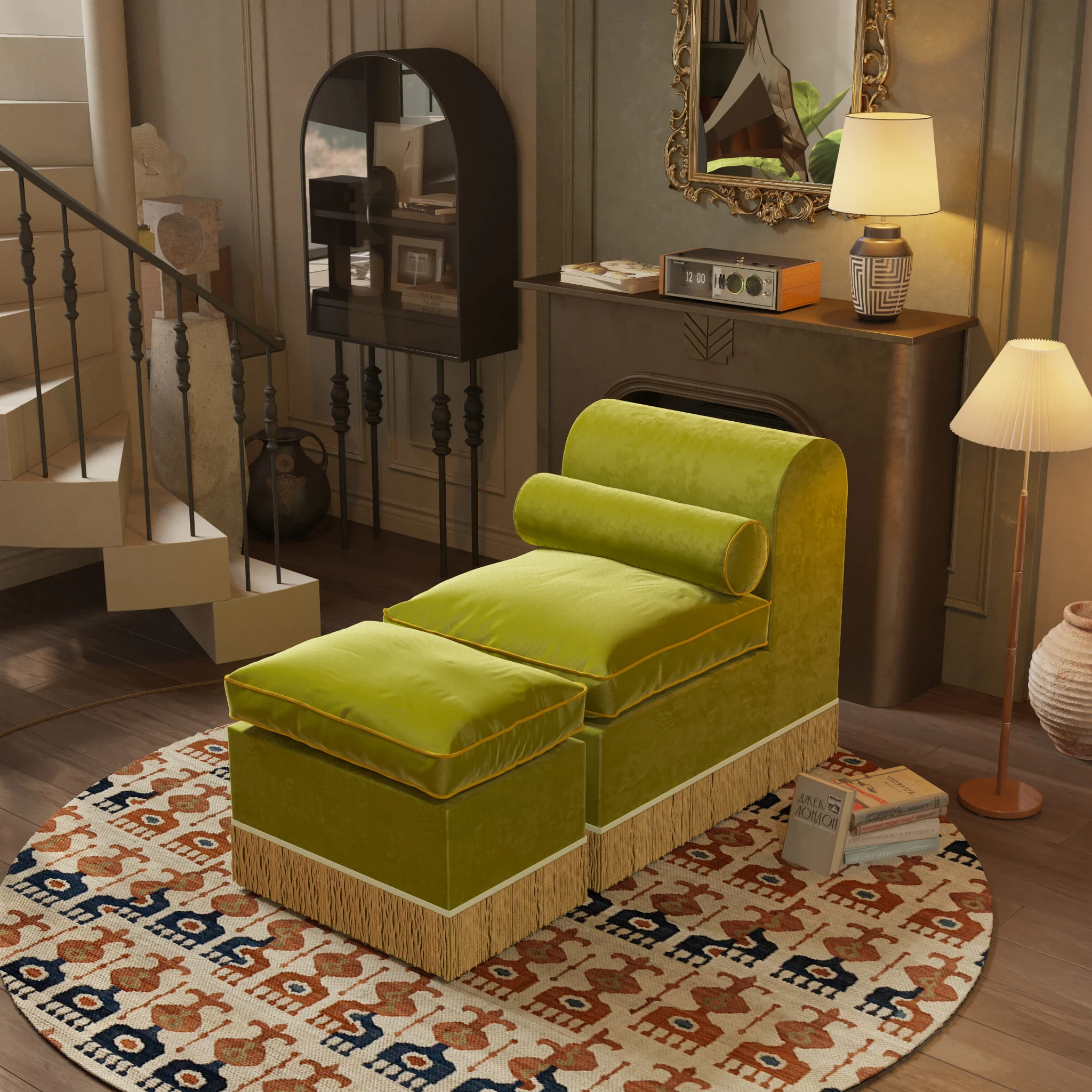 Ten fotel to kwintesencja stylu BOHO CHIC z nutą glamour. Obfite, głębokie siedzisko i dopasowany podnóżek (pufa) tworzą idealne miejsce do relaksu, czytania lub popołudniowej drzemki. Całość tapicerowana jest miękkim, aksamitnym welurem w energetycznym odcieniu limonkowej zieleni, który wprowadzi do Twojego domu świeżość i pozytywną energię.