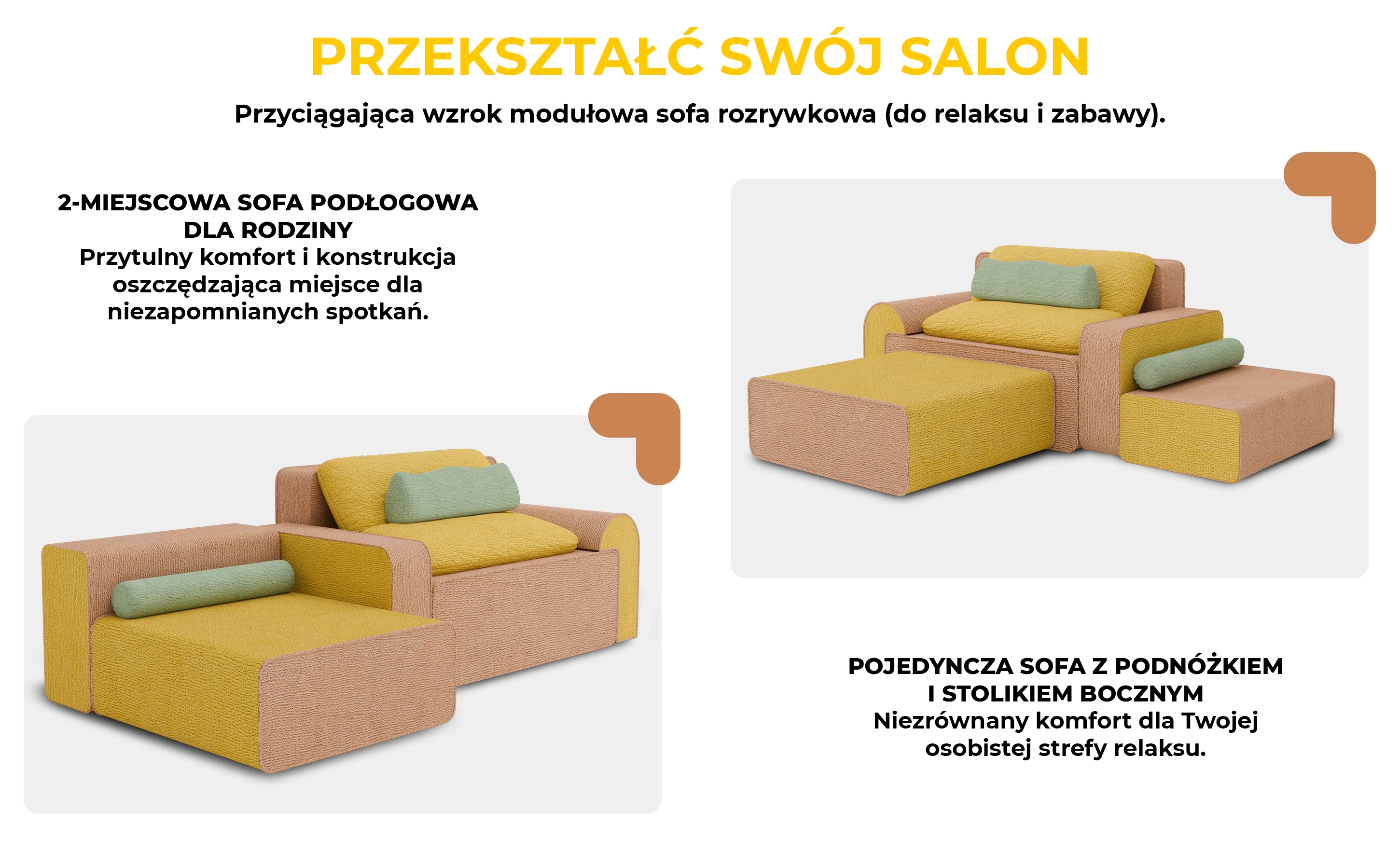 Zaprojektowana z myślą o nowoczesnych rodzinach, wyróżnia się układem dwustrefowym, który pozwala oddzielić obszar pracy od strefy zabawy. Pluszowe poduszki z pianki o wysokiej gęstości zapewniają komfort przez cały dzień, a wszechstronne akcesoria, takie jak pufa (ottoman) i poduszka lędźwiowa, zwiększają funkcjonalność.