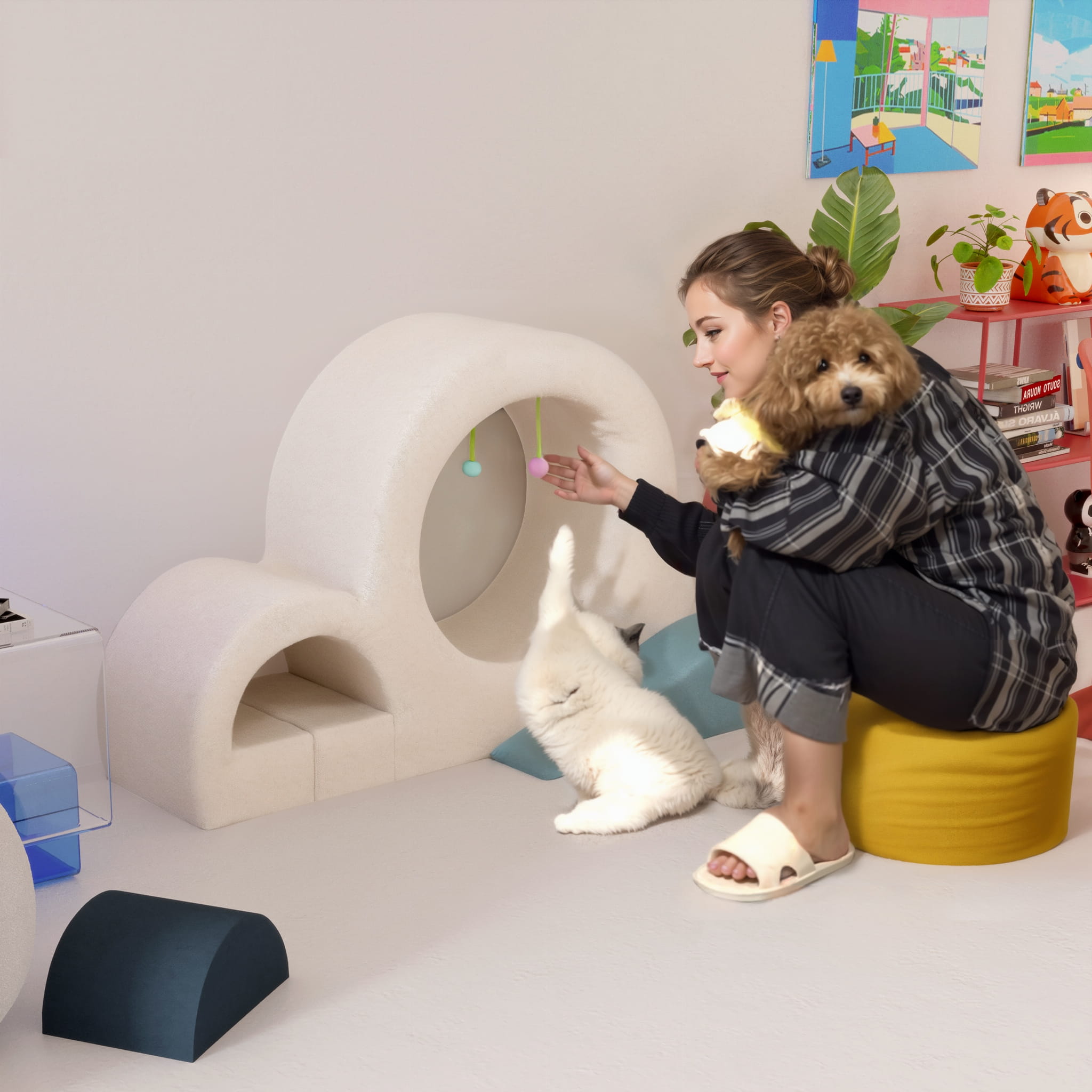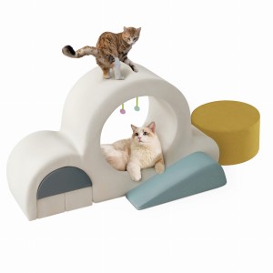 PRZESTRONNA JASKINIA DLA KOTA: Centralny element to przytulna, owalna wnęka (13 cali/33 cm szerokości, 10 cali/25 cm wysokości), idealna do spokojnego snu w samotności lub do zabawy w chowanego. Wnętrze wyposażone jest w miękki, okrągły, żółty moduł (15.7 cala/40 cm średnicy) zapewniający maksymalny komfort.