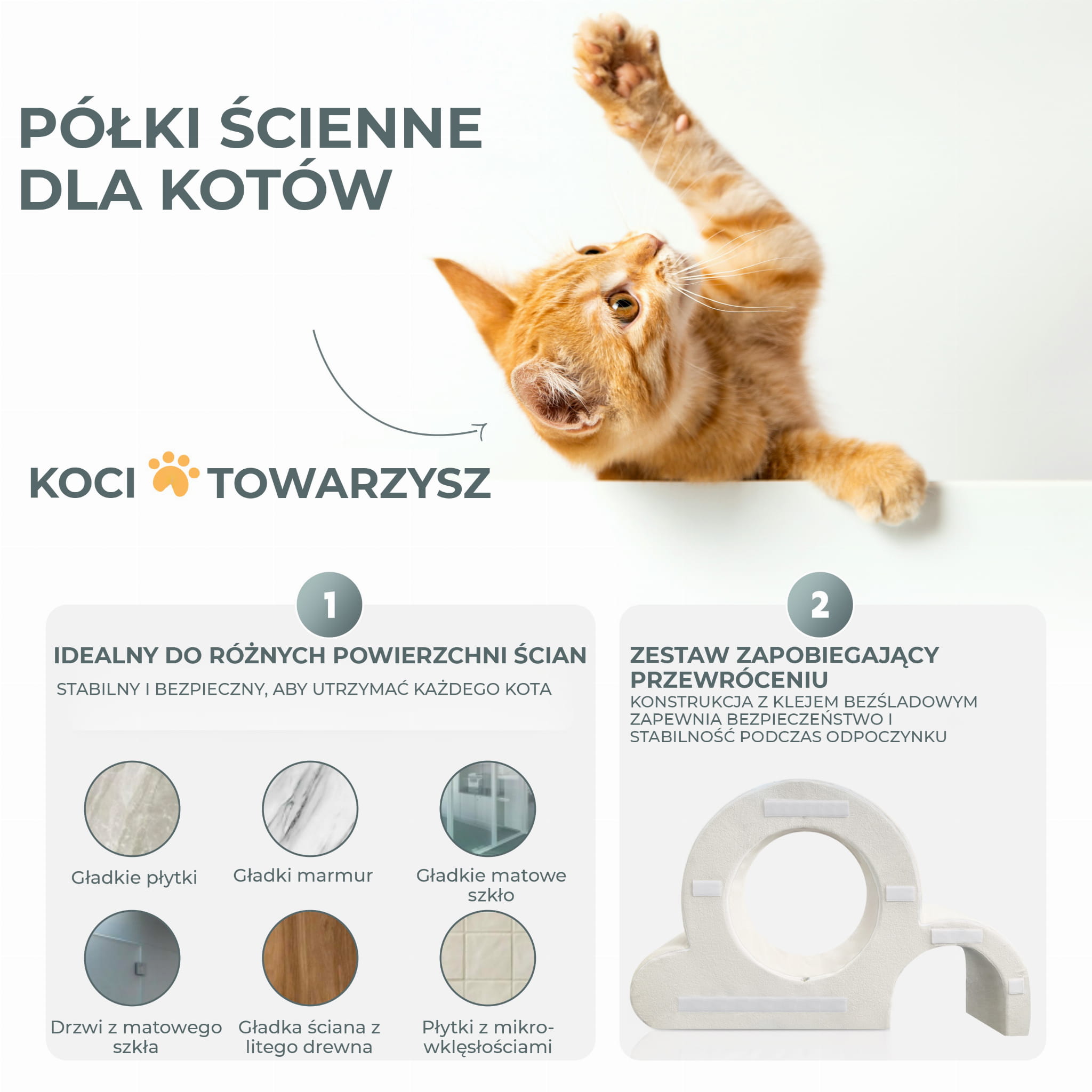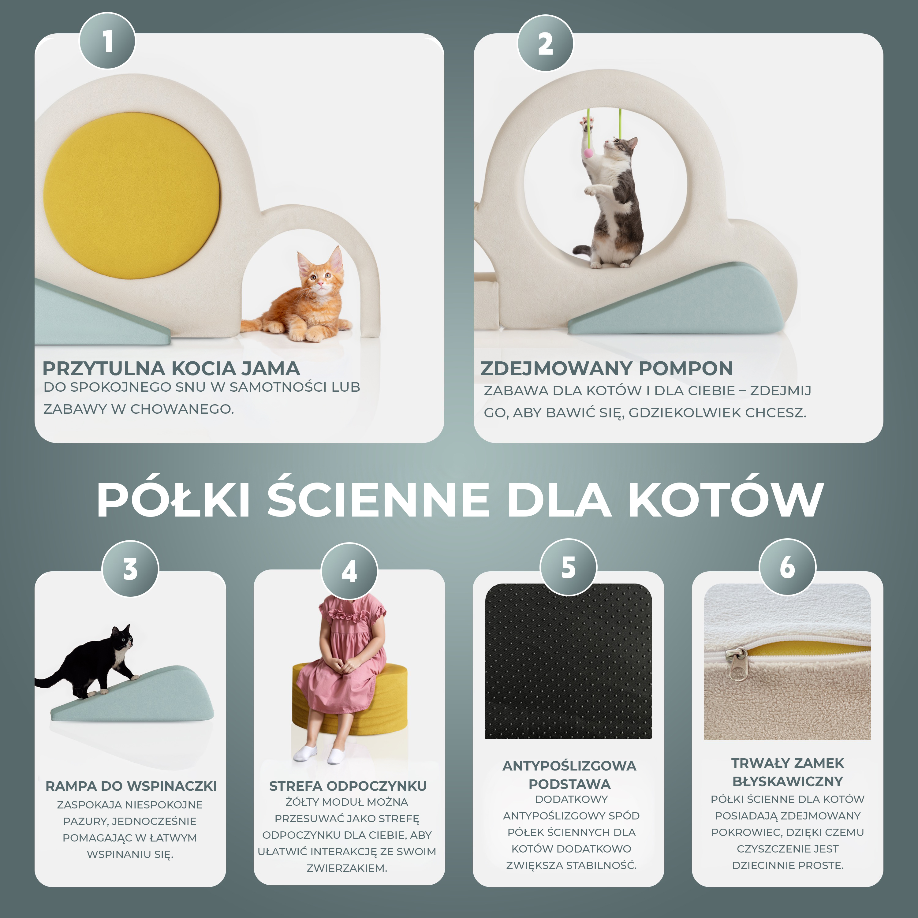 TRWAŁY ZAMEK BŁYSKAWICZNY: W przypadku modułów ściennych i poduszek użyto trwałego zamka błyskawicznego, dzięki czemu zdejmowanie pokrowców do czyszczenia jest dziecinnie proste. * ZESTAW ZAPOBIEGAJĄCY PRZEWRÓCENIU (Wersja ścienna): Chociaż produkt ten jest zazwyczaj wolnostojący, jego elementy są często częścią szerszego systemu modułowego. Konstrukcja z klejem bezśladownym (przy montażu ściennym) zapewnia bezpieczeństwo i stabilność podczas odpoczynku. IDEALNY DO RÓŻNYCH POWIERZCHNI ŚCIAN, takich jak gładkie płytki, gładki marmur czy gładkie matowe szkło. Kocia Drabinka Wspinaczkowa to inwestycja w szczęście i zdrowie Twojego kota, zapewniająca mu bezpieczne miejsce do zabawy, relaksu i zaspokajania instynktów wspinaczkowych.