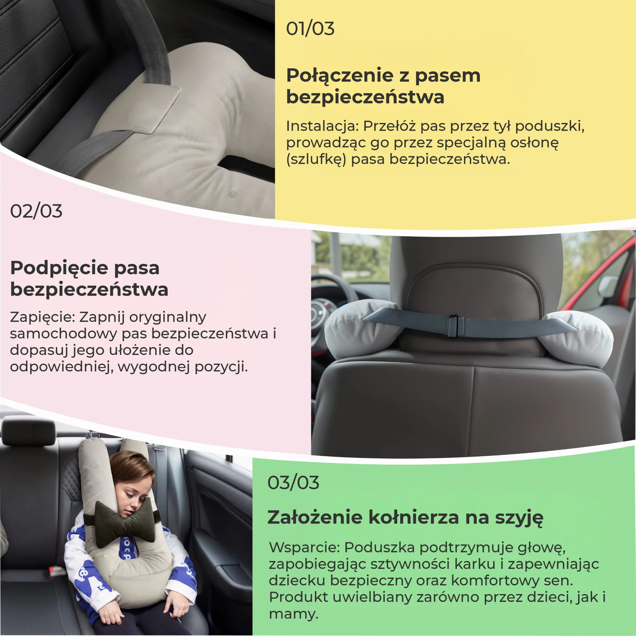 Zapnij oryginalny pas samochodowy i dopasuj ułożenie poduszki do wygodnej pozycji.