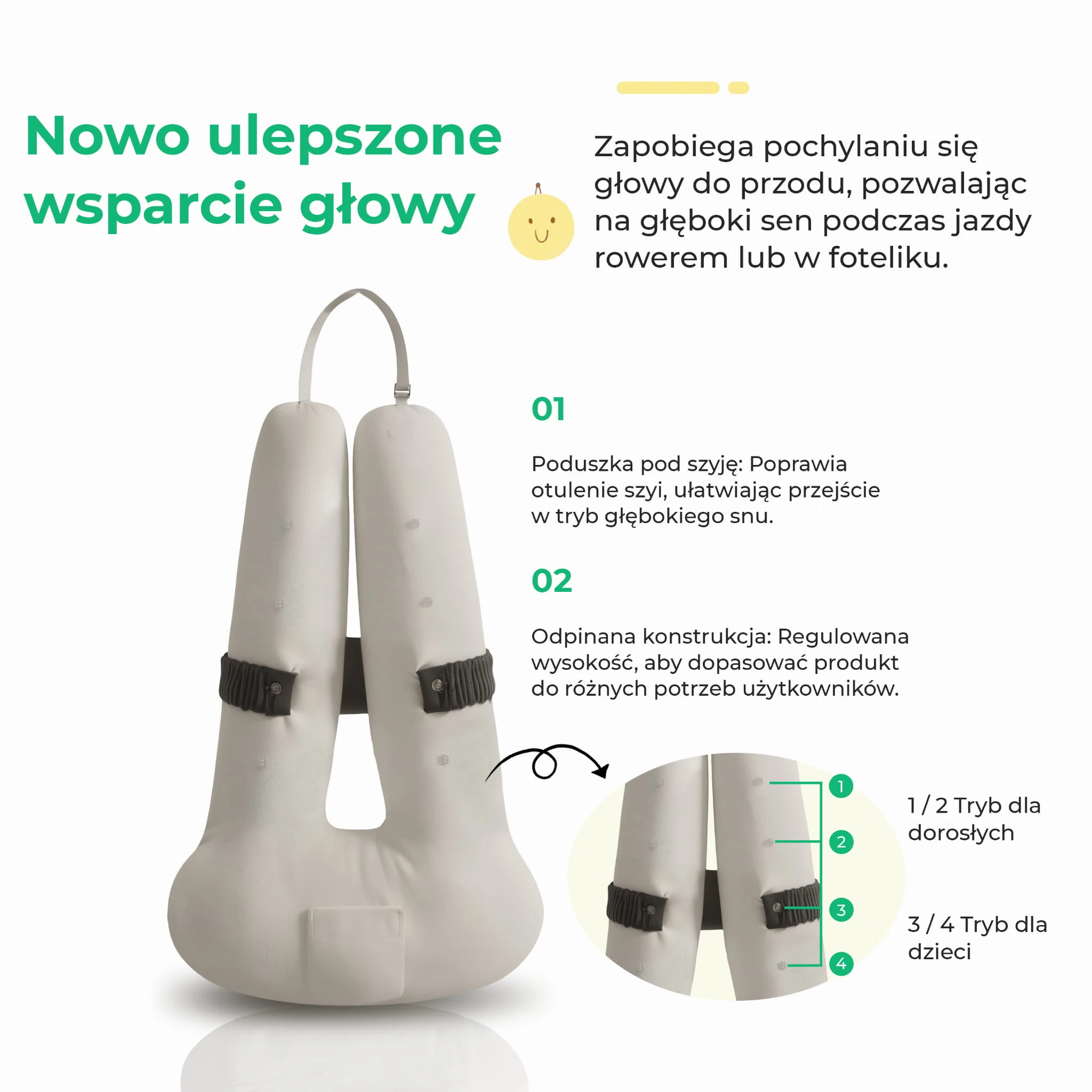 Pełna regulacja i uniwersalność: Poduszka posiada regulowany pasek, który pozwala dostosować jej wysokość do wzrostu pasażera. Dzięki temu świetnie sprawdzi się zarówno u dzieci, jak i u dorosłych (system 4-stopniowej regulacji trybu).