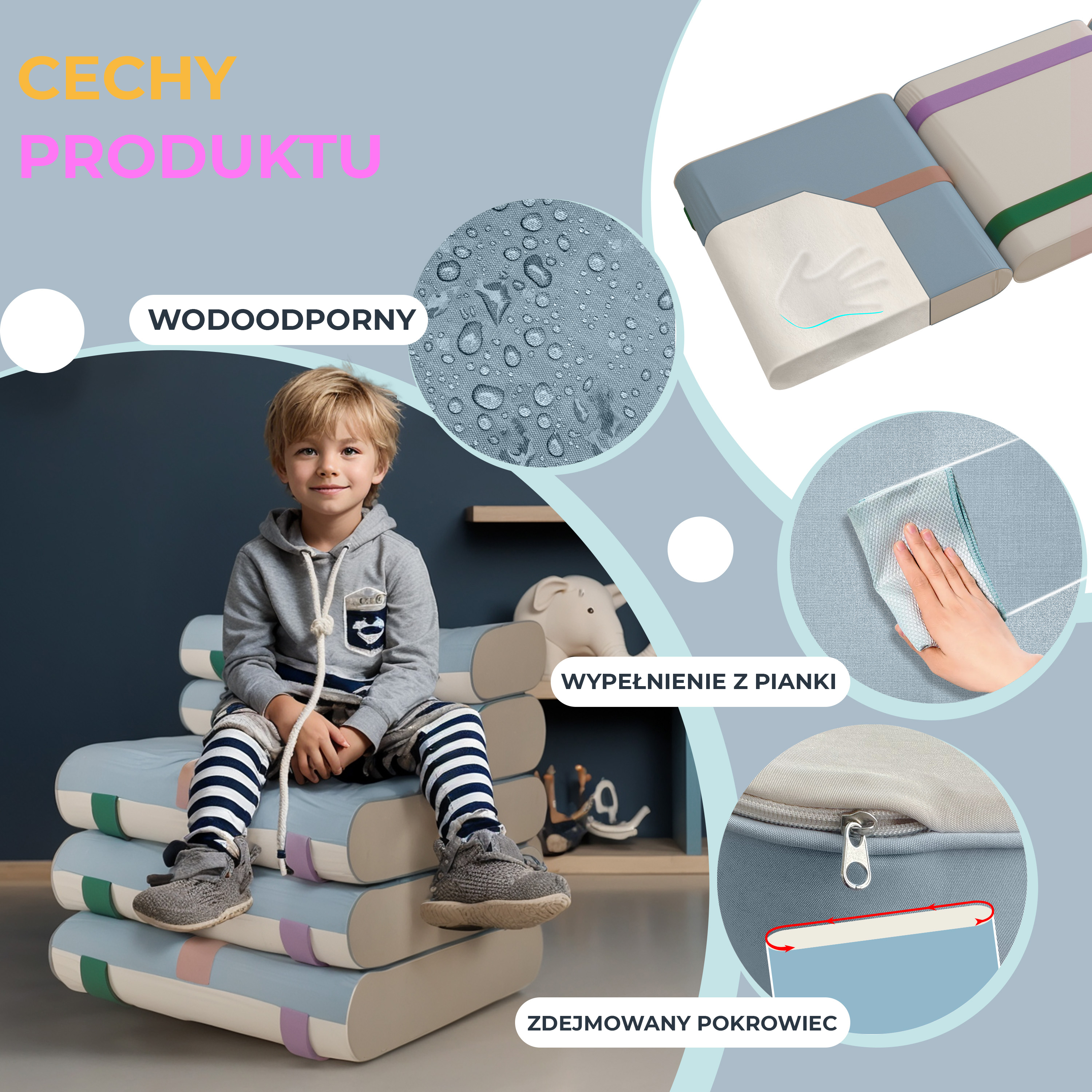Kreatywna Mata Podłogowa to innowacyjne rozwiązanie, które rośnie razem z Twoim dzieckiem. To nie jest zwykła wycieraczka! Ten modułowy zestaw łączy w sobie komfort, bezpieczeństwo i nieograniczoną zabawę. Dzięki łatwej transformacji, szybko dostosujesz przestrzeń do snu, zabawy lub relaksu – idealne do pokoju dziecięcego, kącika zabaw lub salonu.