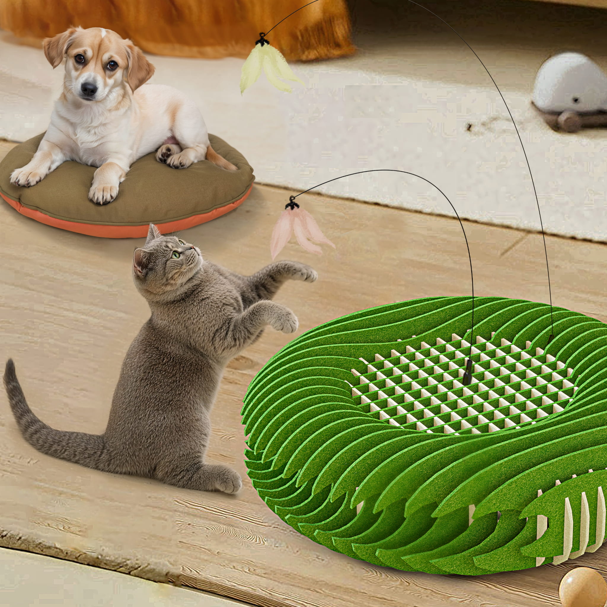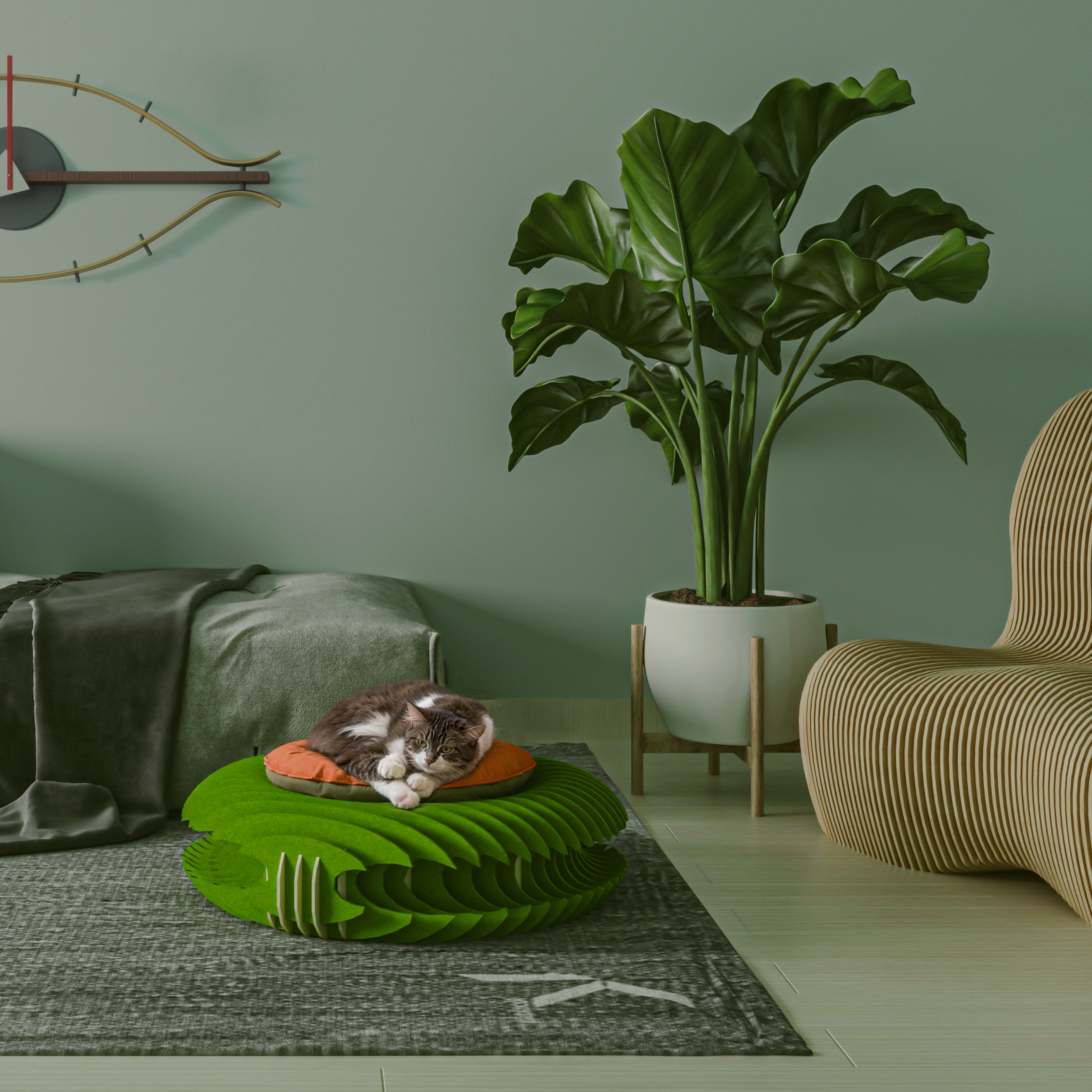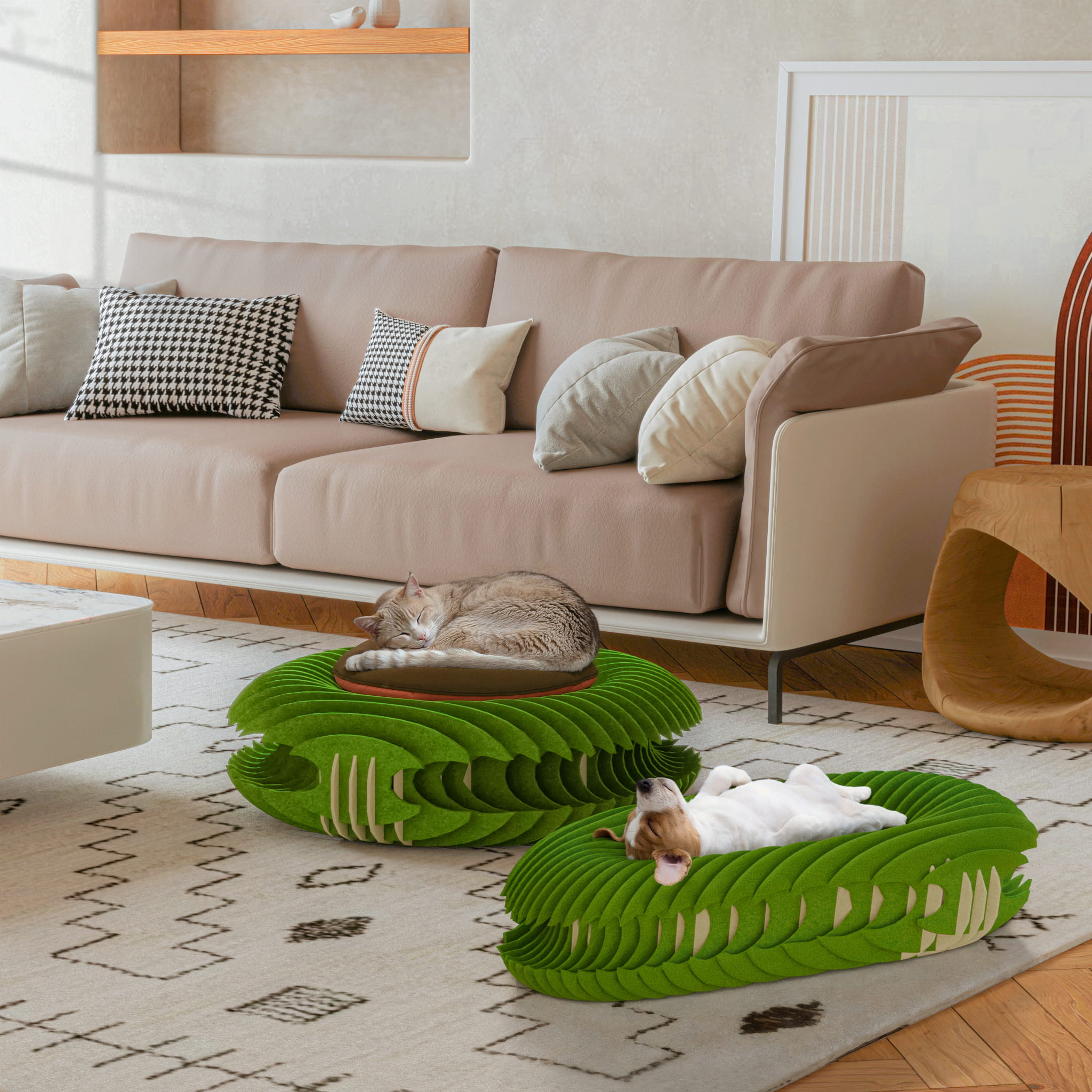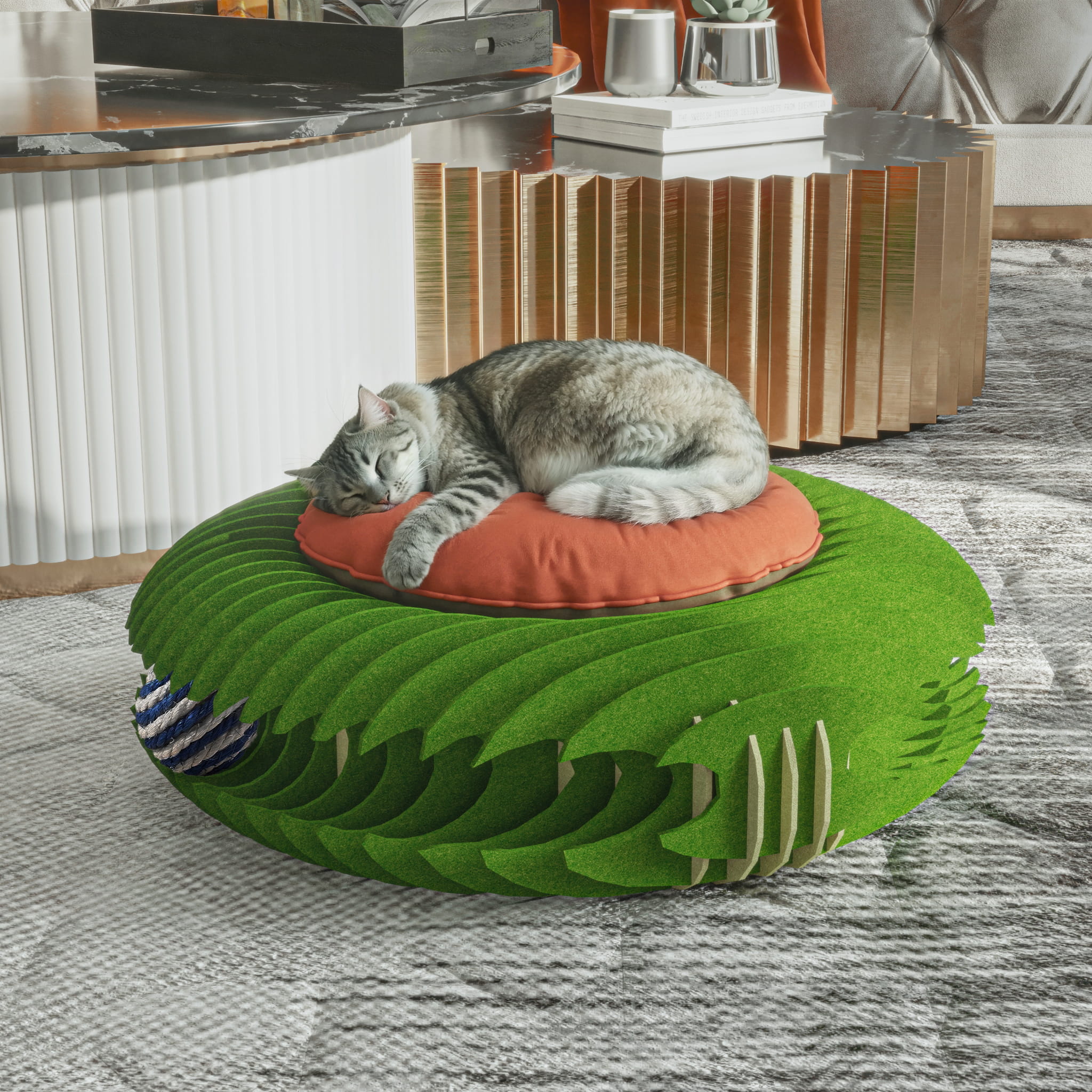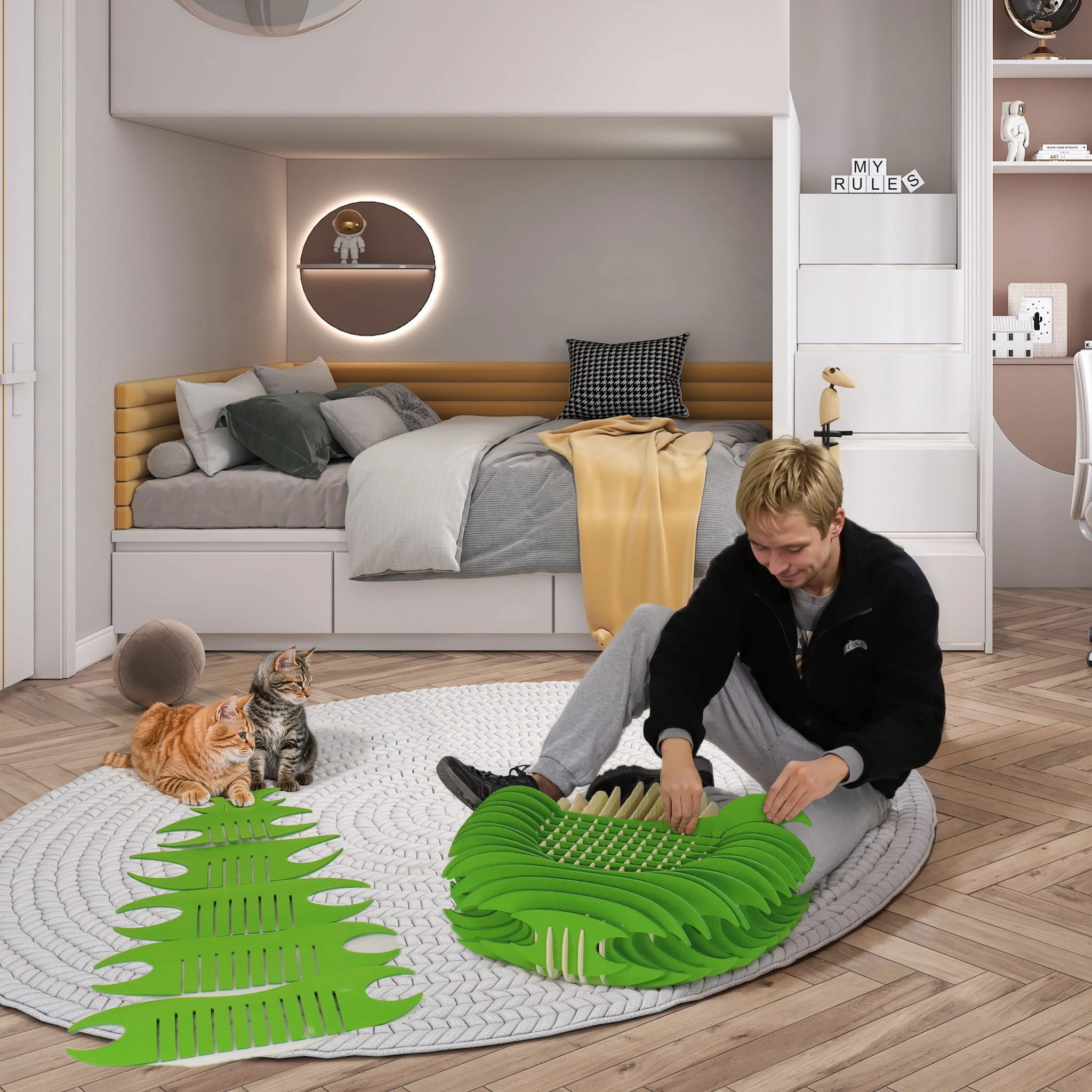 Legowisko wyróżnia się unikalnym, warstwowym designem w żywym, zielonym kolorze, przypominającym naturalną trawę lub liście. Jest to nie tylko estetyczny dodatek do każdego wnętrza, ale przede wszystkim wielofunkcyjne centrum aktywności: