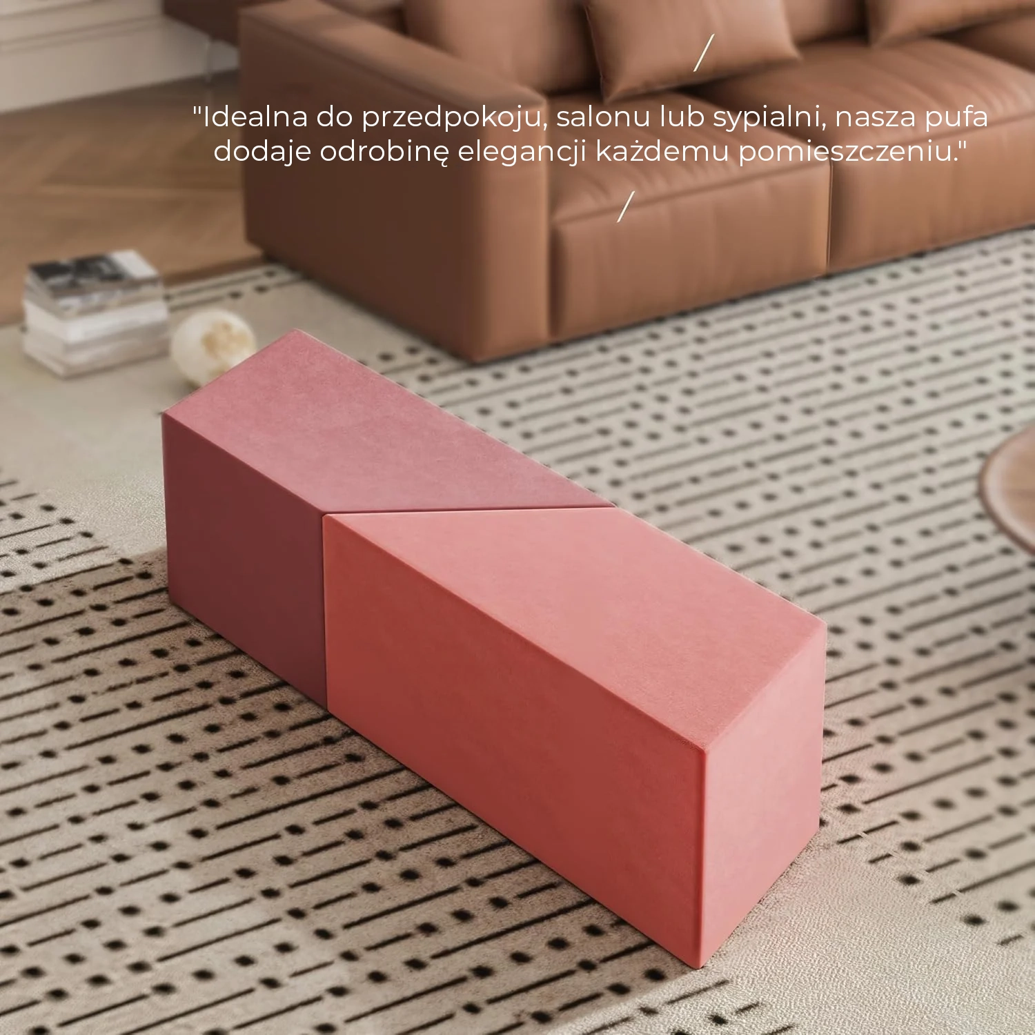 Te pufy w kształcie trapezoidów mają pluszowe aksamitne pokrowce i wypełnienie z pianki o wysokiej gęstości, zapewniające najwyższy komfort. Ich modułowa konstrukcja pozwala dowolnie zestawiać je jako podnóżki, dodatkowe siedziska lub elegancki stolik kawowy.