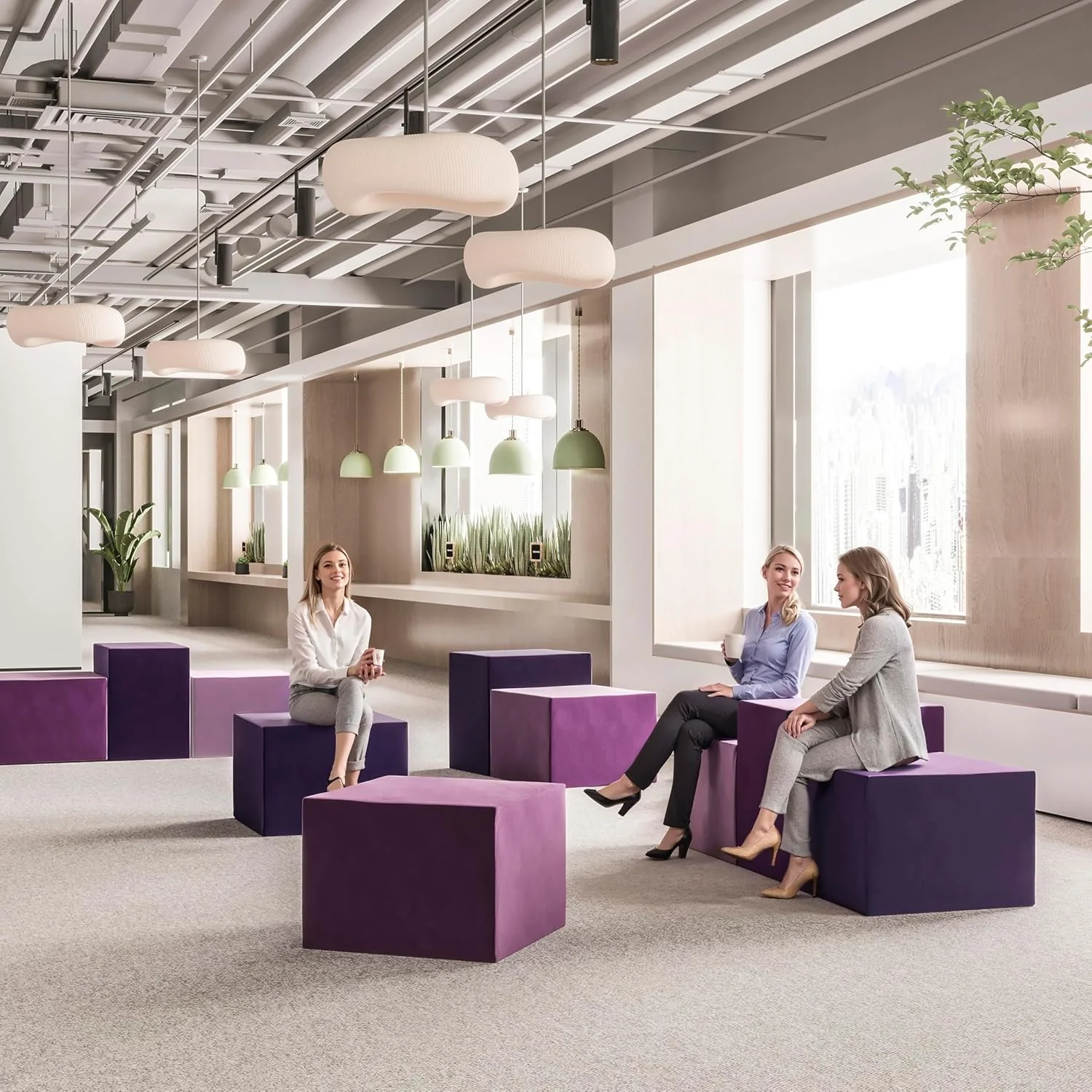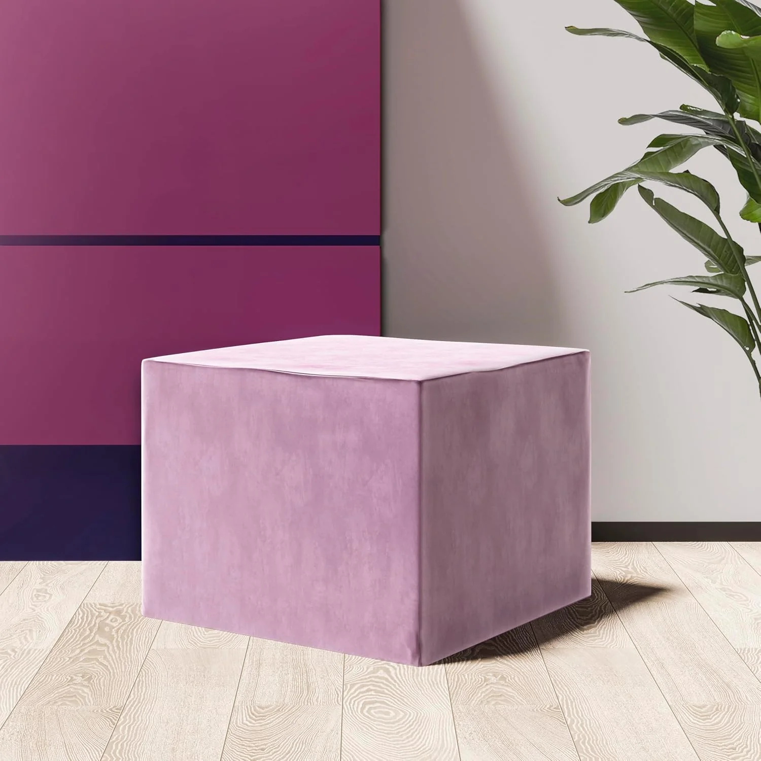 Dowolna Aranżacja: Zestaw składa się z trzech lawendowych puf w kształcie sześcianu, które możesz dowolnie konfigurować, tworząc niestandardowe kształty.