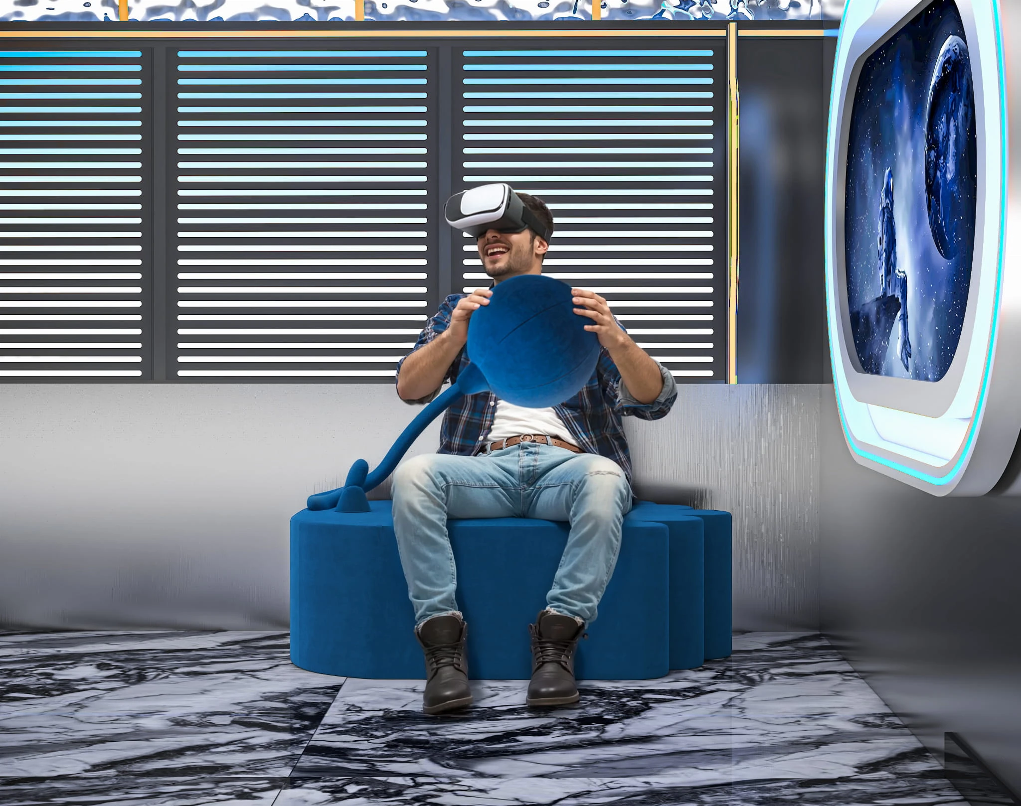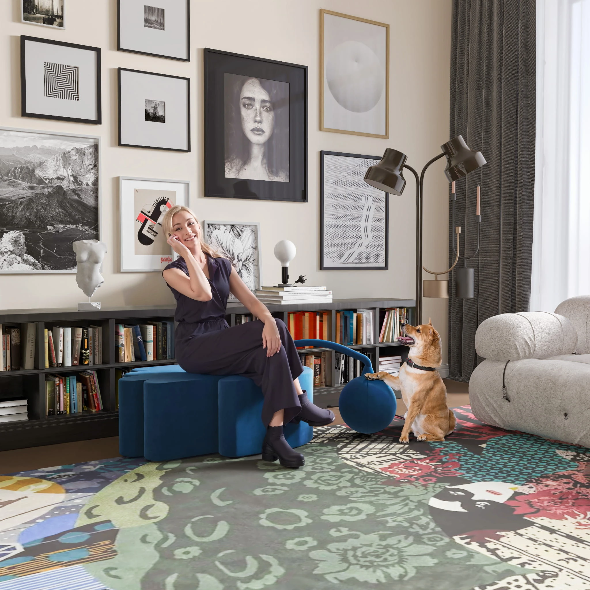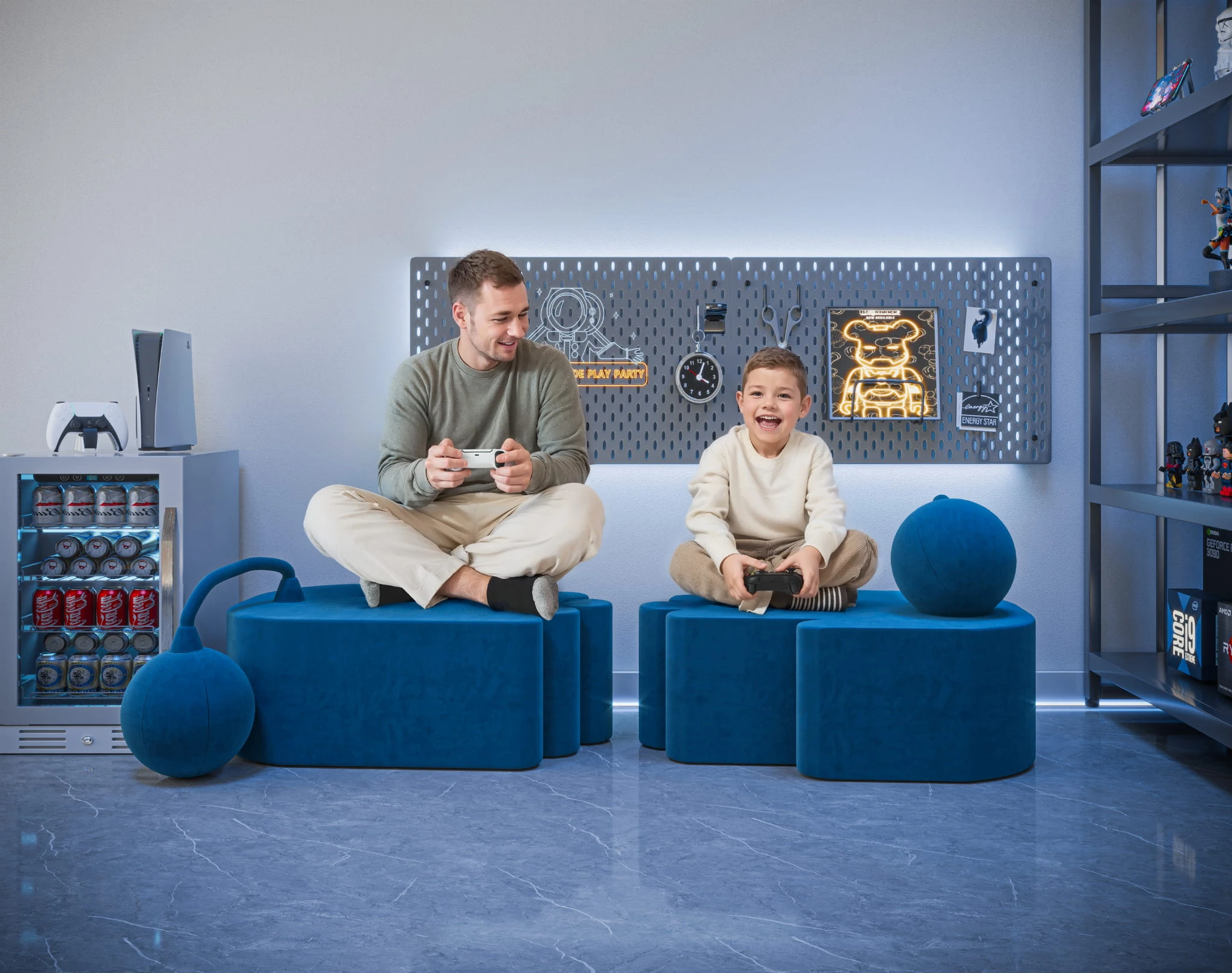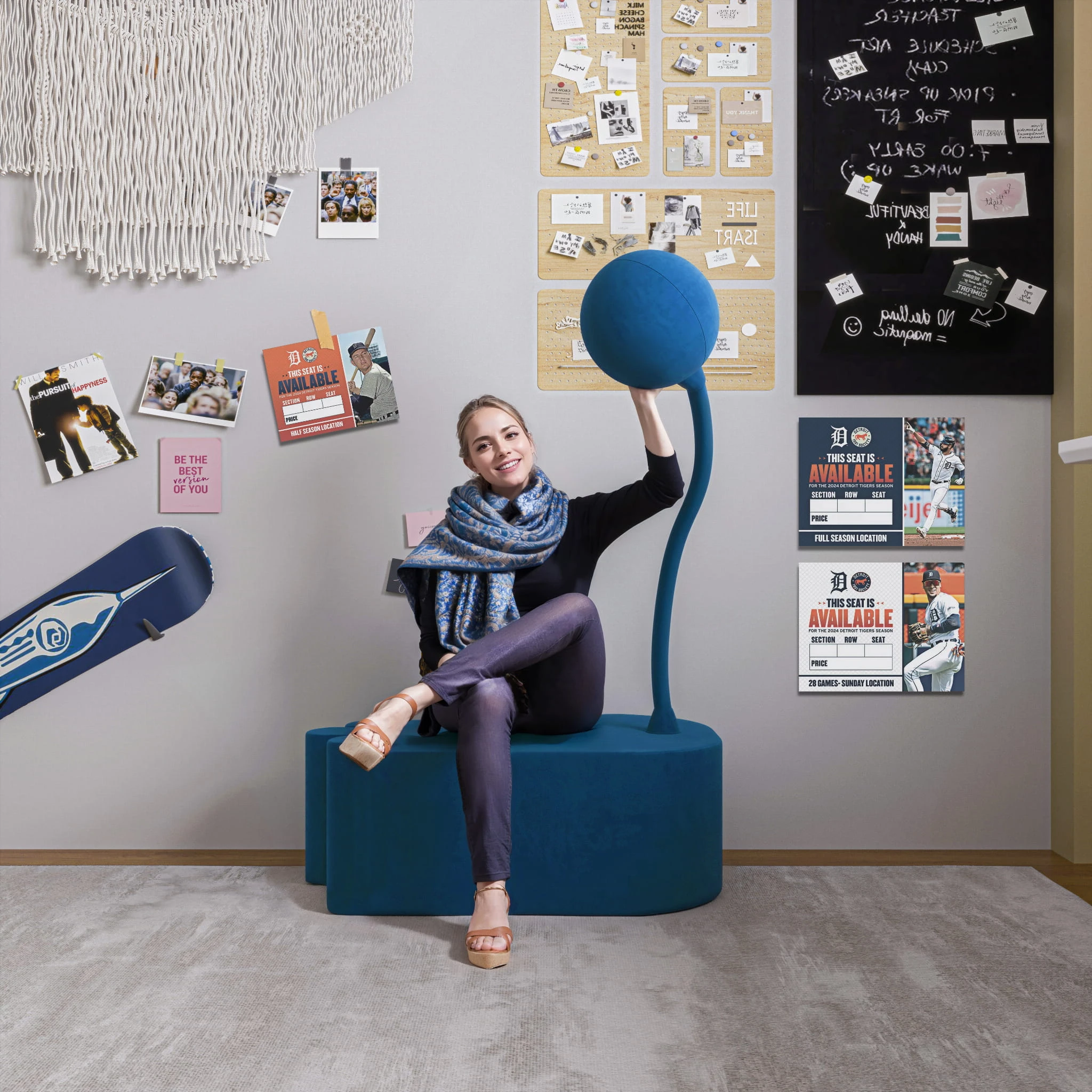Nasza pufa została zaprojektowana z myślą o dynamicznym stylu życia. Jej głęboki, nasycony odcień niebieskiego doskonale komponuje się zarówno z minimalistycznymi, białymi wnętrzami, jak i z bogatymi, artystycznymi aranżacjami. Charakterystyczna, geometryczna podstawa przypominająca puzzle oraz dołączony elastyczny element z kulą dają nieskończone możliwości interakcji i zabawy formą.