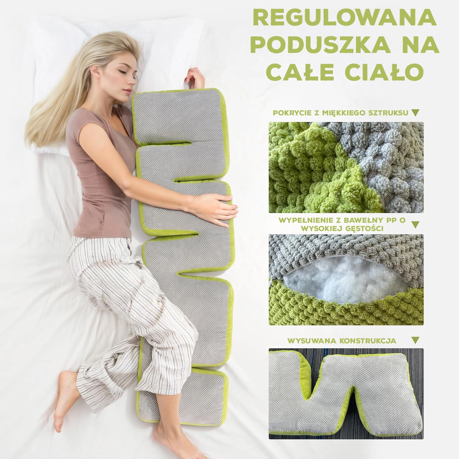 Inteligentna Regulacja i Idealne Dopasowanie Rozciąga się od 145 cm do 180 cm, pasując do większości ram łóżek i zapewniając idealne przyleganie do ściany. Możliwość przewracania na dwie modne strony (szara i zielona) pozwala dopasować poduszkę do nastroju lub wystroju.
