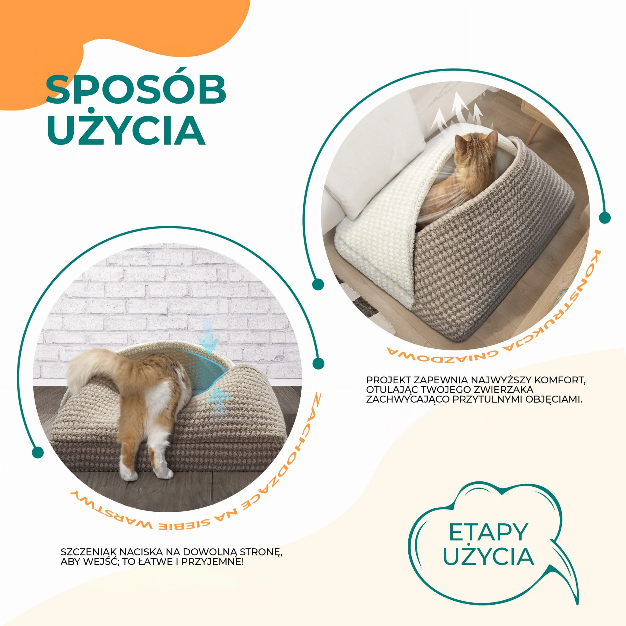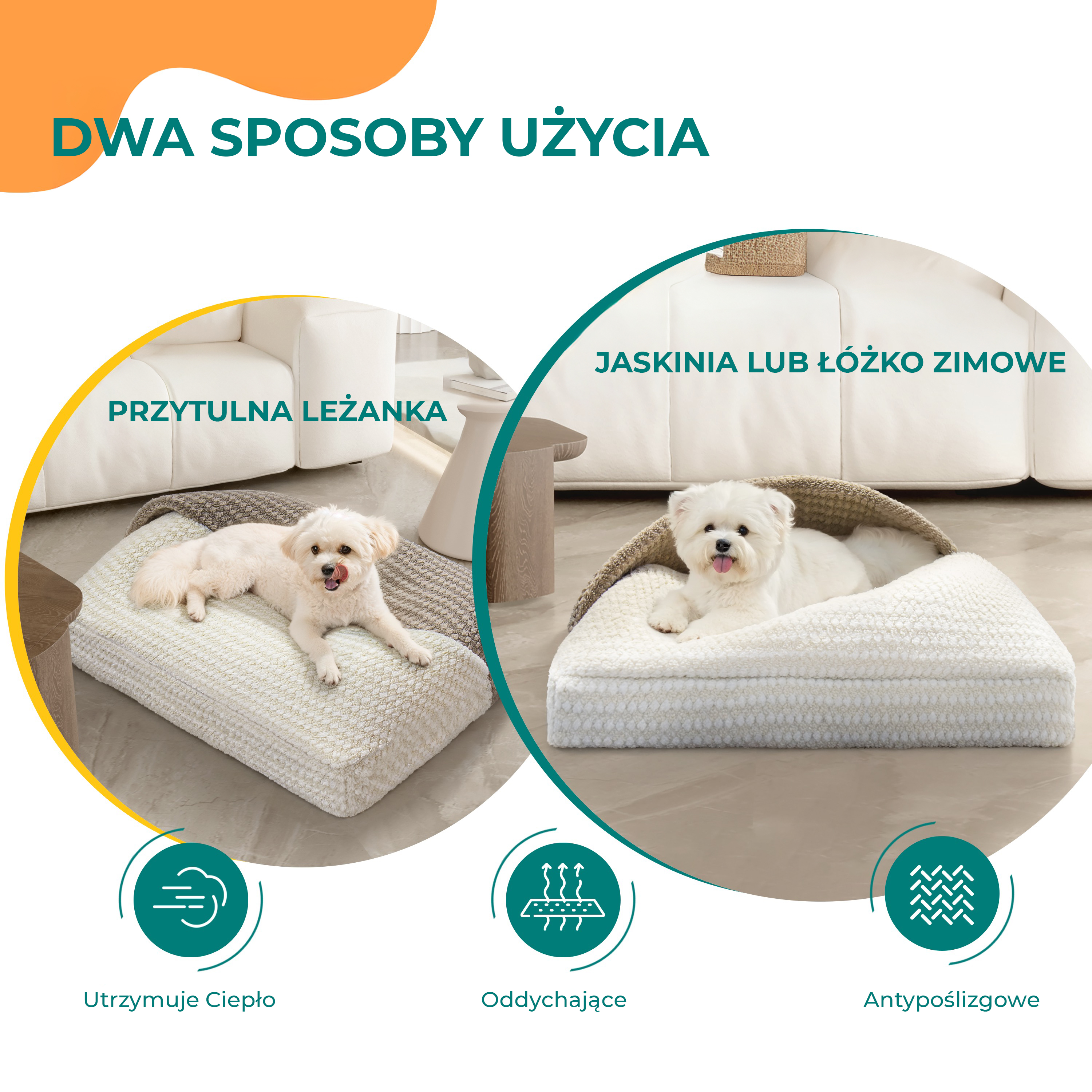 Jaskinia lub Łóżko Zimowe: Kaptur wznosi się nad legowiskiem, tworząc przytulną jaskinię. Jest to idealne rozwiązanie dla psów i kotów, które uwielbiają się zakopywać, czuć otulone i potrzebują dodatkowego ciepła w chłodniejsze dni. Zapewnia to maksymalne poczucie bezpieczeństwa.
