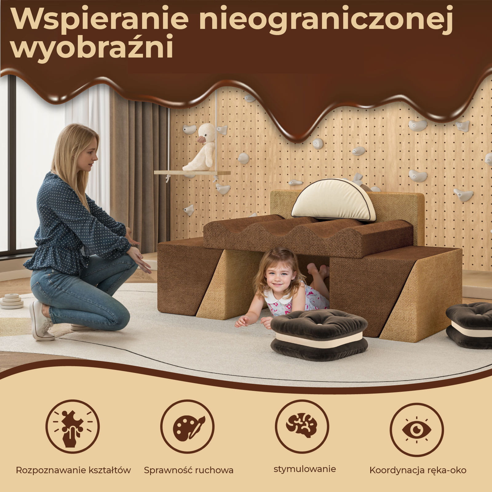 Przedstawiamy Państwu nasz innowacyjny, wielofunkcyjny Plac Zabaw dla Dzieci – projekt inspirowany uwielbianym czekoladowym deserem! Ten uroczy, modułowy zestaw piankowych elementów to idealne rozwiązanie, które zamieni każdy pokój w przestrzeń pełną kreatywności i dynamicznej zabawy.
