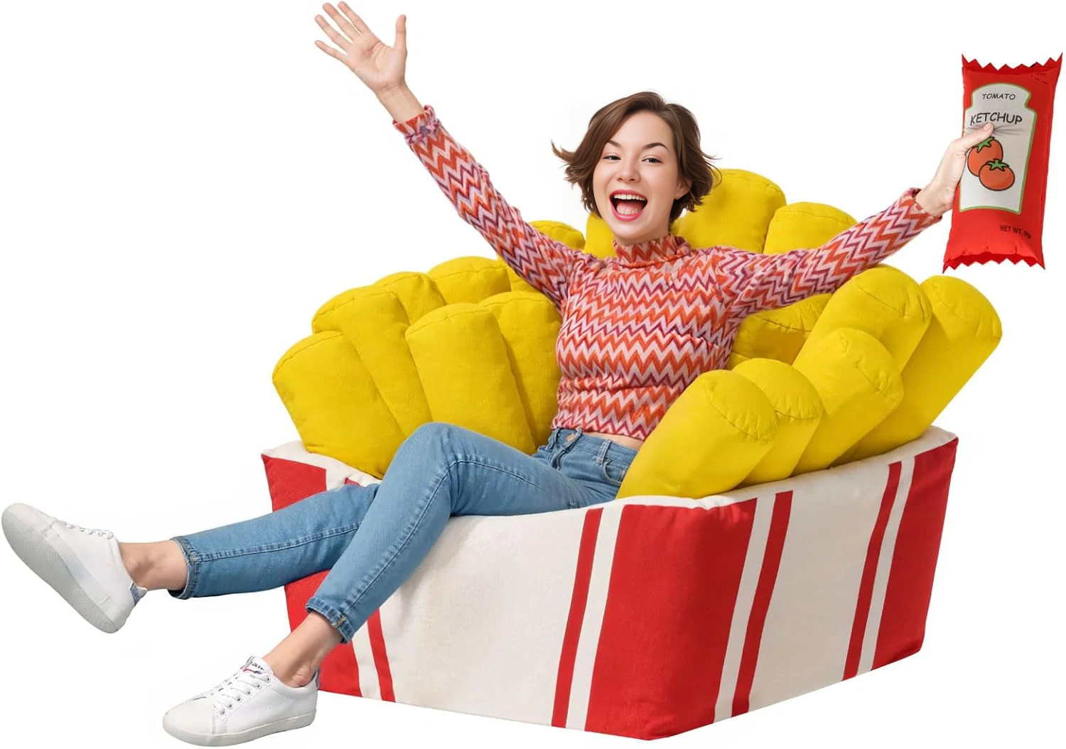 Zmodyfikuj Strefę Relaksu: Rozmieść 25 miękkich poduszek w kształcie frytek, aby stworzyć idealną aranżację wypoczynkową. Połóż się, zwiń w kłębek lub zbuduj przytulne gniazdo do czytania, grania lub wieczorów filmowych!