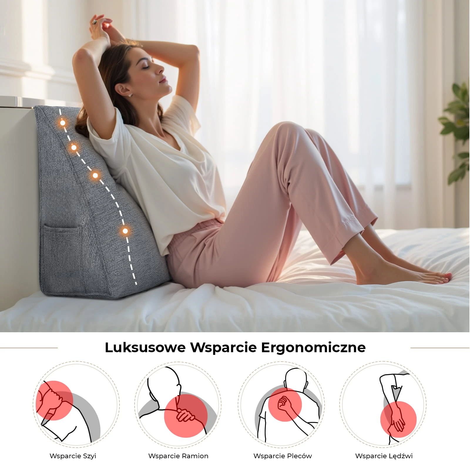 Zapomnij o bólach pleców i sztywności karku. Specjalnie zaprojektowany, klinowy kształt poduszki zapewnia wielopunktowe podparcie: od odcinka lędźwiowego, przez plecy i ramiona, aż po szyję. Dzięki optymalnemu kątowi nachylenia, Twoje ciało naturalnie przyjmuje zdrową, odprężającą pozycję, redukując napięcie mięśniowe zgromadzone w ciągu dnia.
