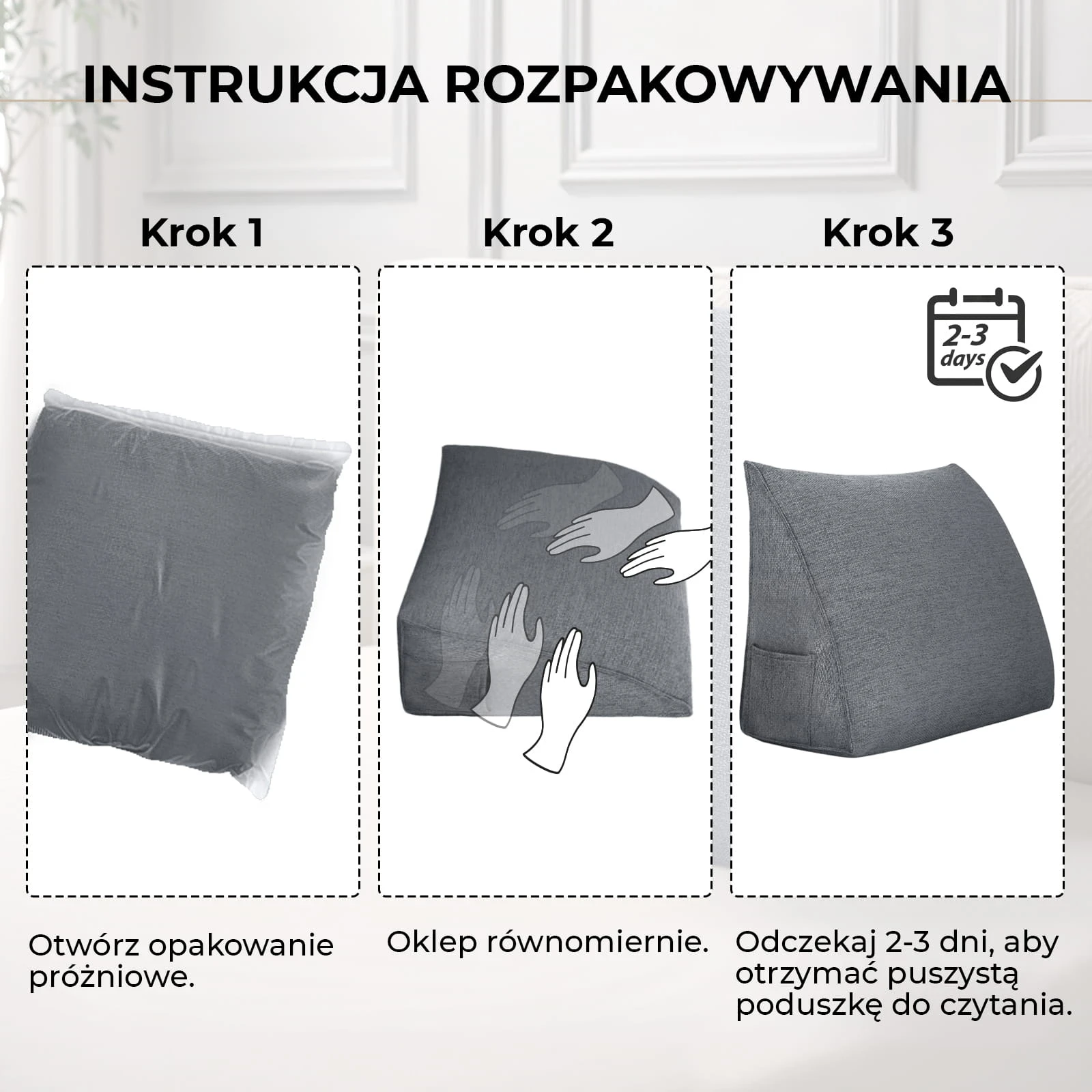 Odczekaj 2-3 dni, aż materiał całkowicie odzyska swój docelowy kształt i objętość.