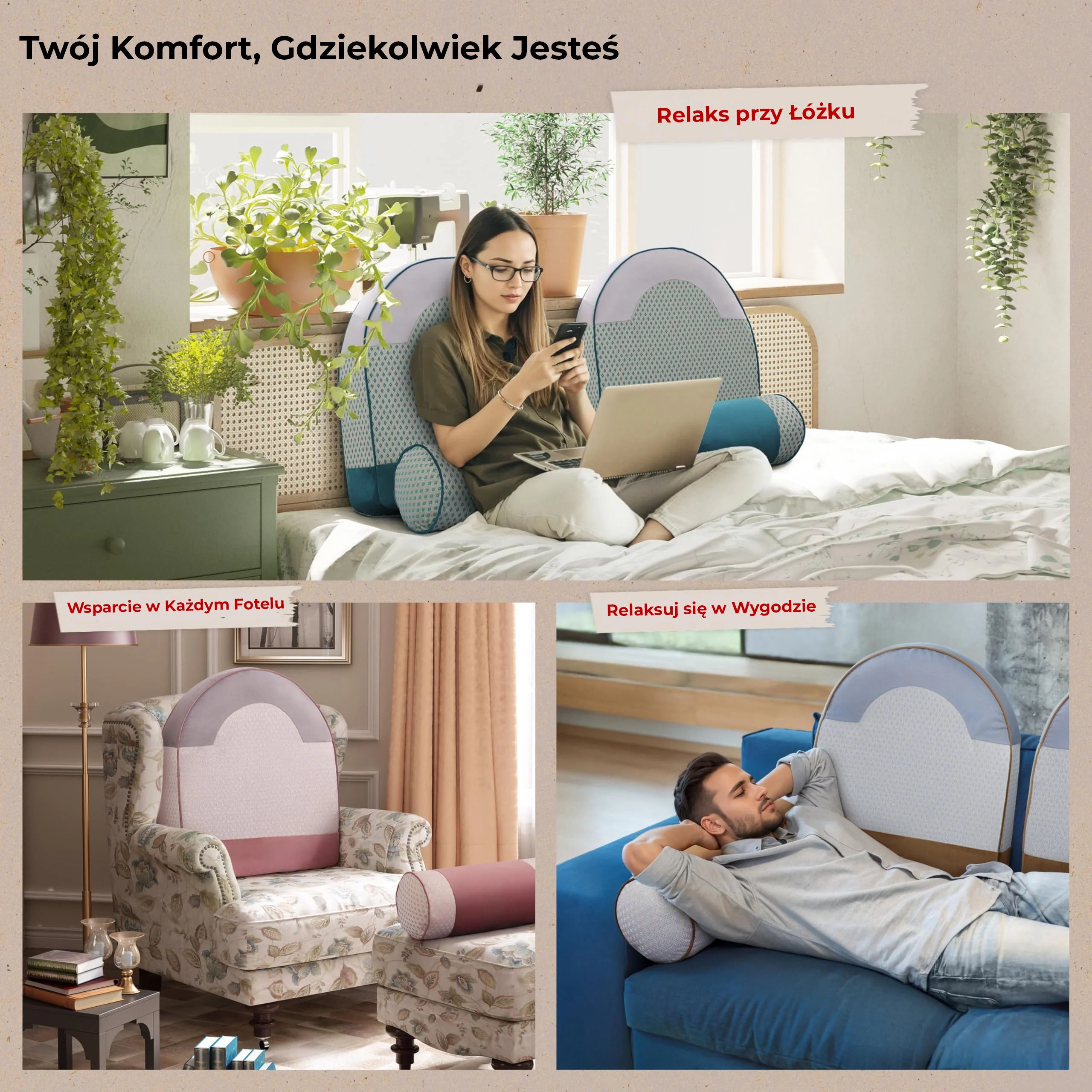 Użycie na Wielu Powierzchniach: Pasuje do sof, krzeseł biurowych, foteli samochodowych lub podłóg, zapewniając komfort 24/7 w domu, w pracy lub w podróży.