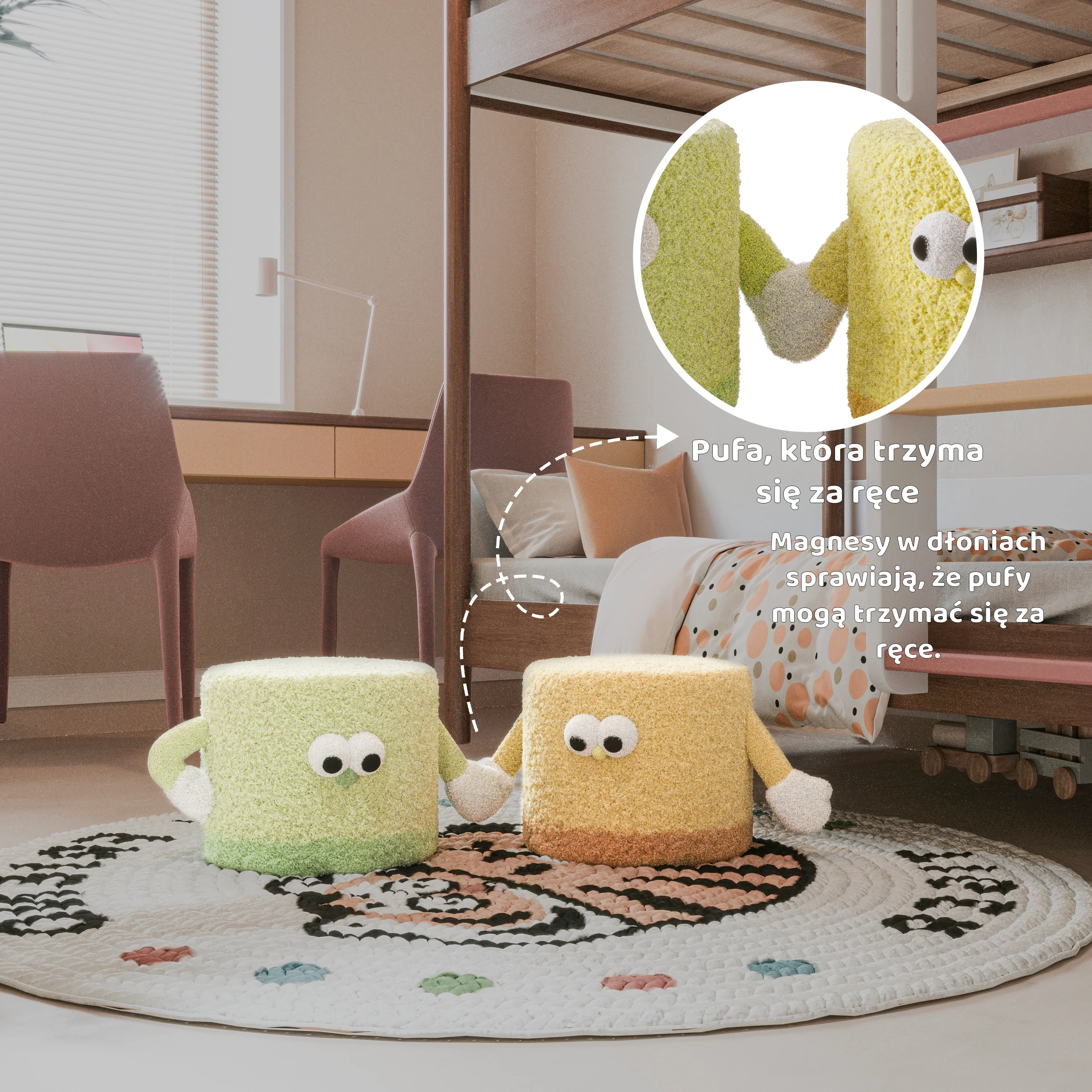 Dziecięcy Podnóżek łączy w sobie zabawny design z funkcjonalnością przyjazną dzieciom. Jego wyjątkowa, magnetyczna funkcja łączenia rączek zachęca do współpracy i pojednania, podczas gdy ultra-miękki aksamitny materiał i piankowe wypełnienie zapewniają bezpieczeństwo oraz komfort. Idealna jako siedzisko, element dekoracyjny lub kreatywny dodatek do przestrzeni zabaw – ta pufa rośnie wraz z wyobraźnią Twojego dziecka.