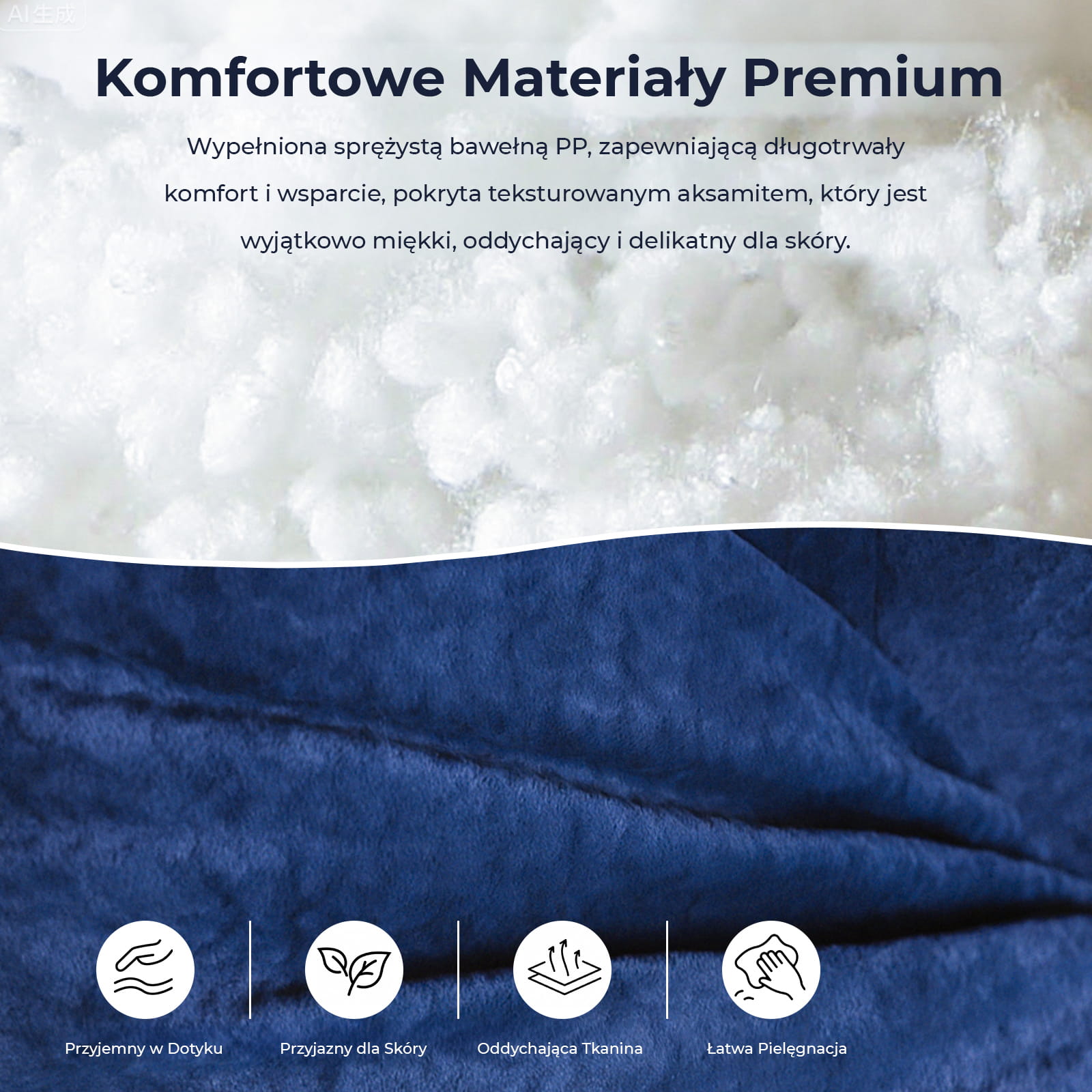 Pufa wypełniona jest sprężystą bawełną PP, która zapewnia trwały komfort i niezawodne wsparcie. Zewnętrzna powłoka została wykonana z teksturowanego aksamitu, który jest wyjątkowo miękki, oddychający i delikatny dla skóry. Materiał ten jest przyjemny w dotyku i łatwy w pielęgnacji, co gwarantuje długie lata użytkowania.