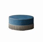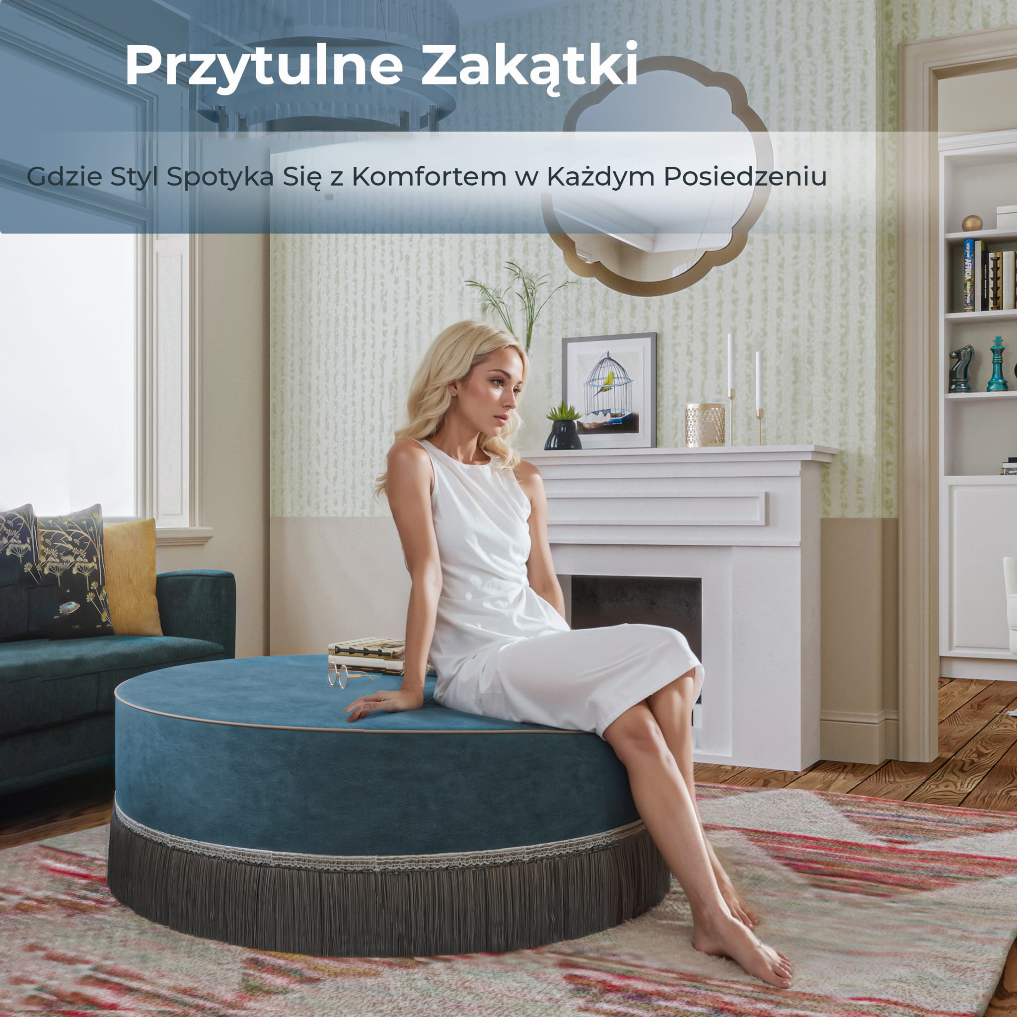 Elegancka aksamitna otomana w salonie, idealna do odpoczynku nóg lub jako dodatkowe miejsce do siedzenia.