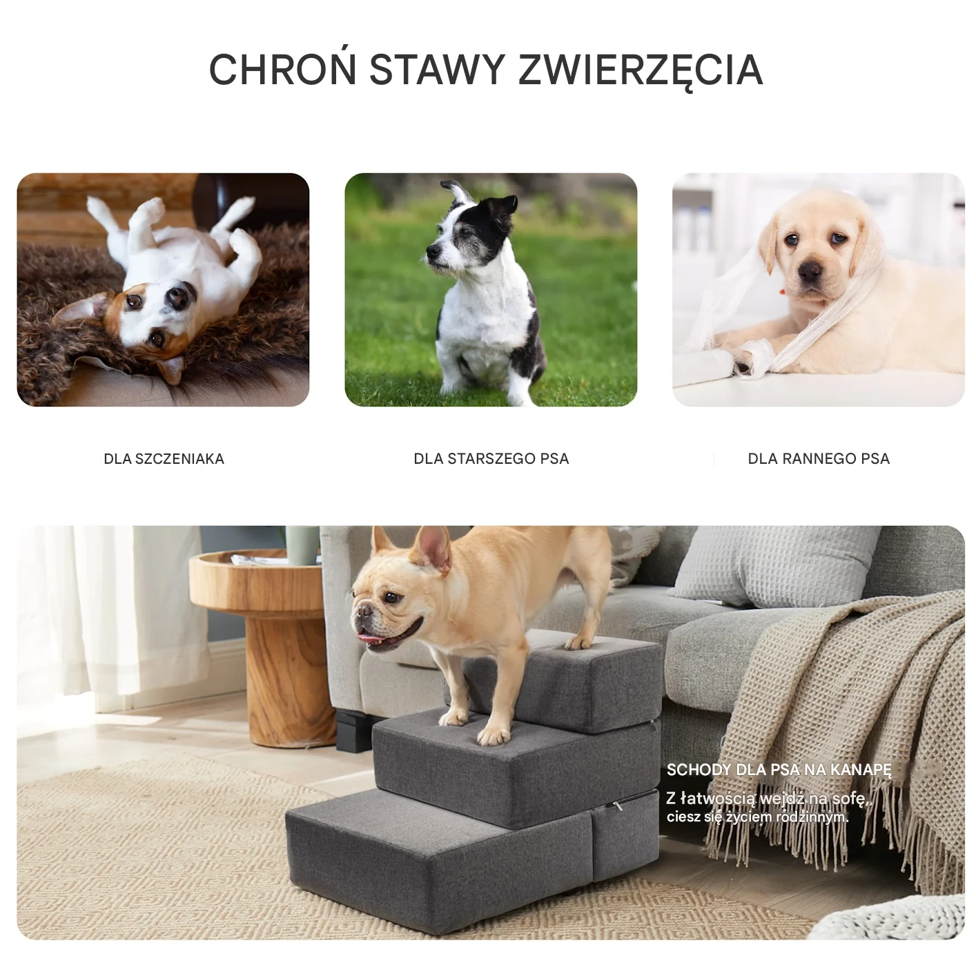Zbudowane z pianki o wysokiej gęstości i antypoślizgowej tkaniny bawełniano-lnianej, schody te zapewniają solidne wsparcie dla starzejących się zwierząt, małych ras lub kontuzjowanych pupili.