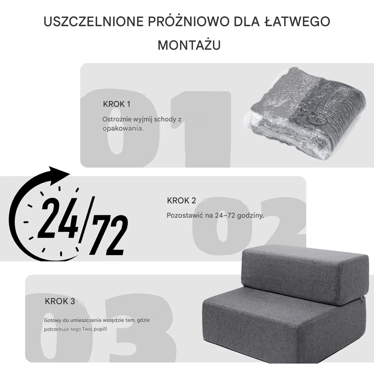 Schody o długości 45 cm z antypoślizgową podstawą zapobiegają poślizgnięciom, podczas gdy pianka o wysokiej gęstości zapewnia pewne, ale delikatne wsparcie dla stawów.
