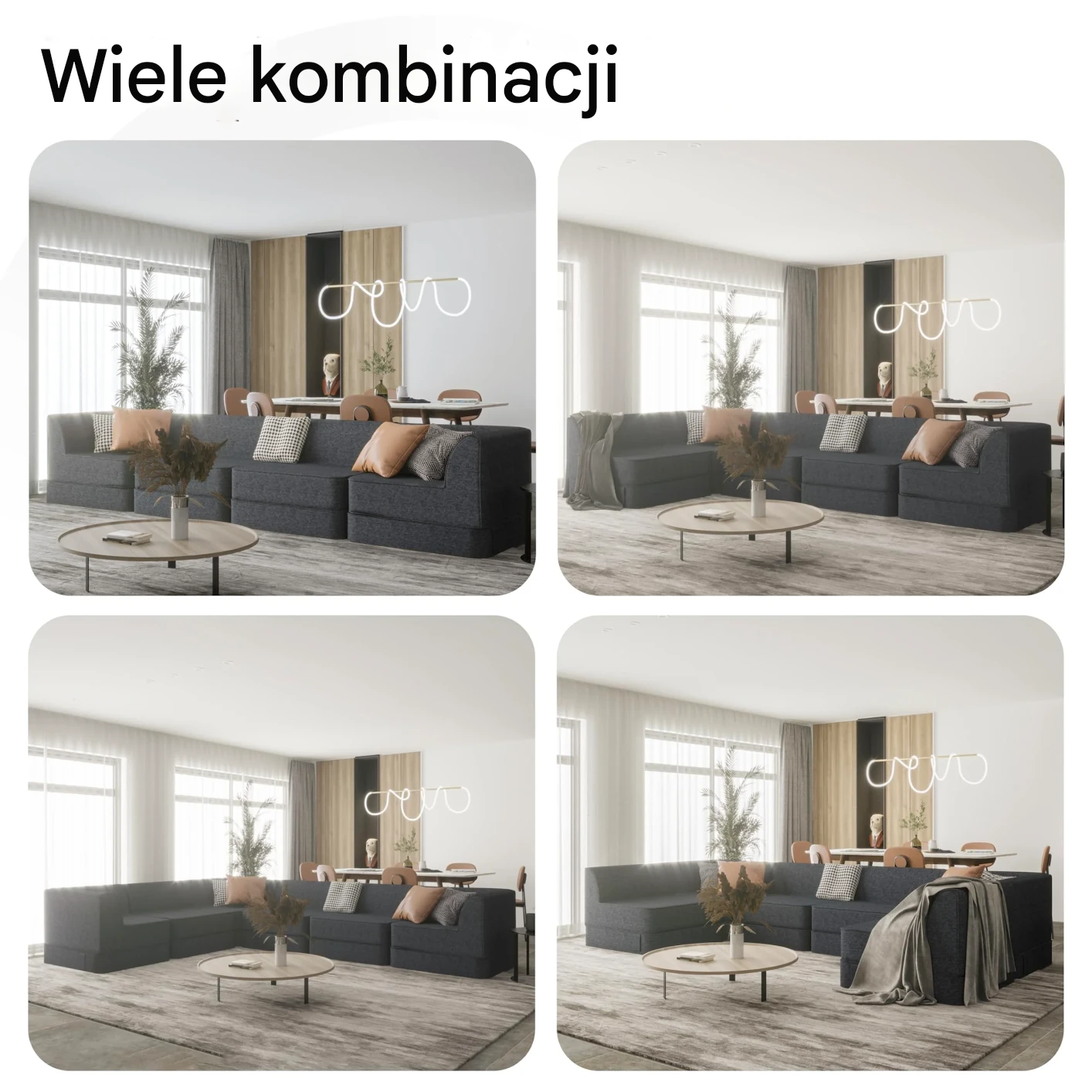 Ostateczna Personalizacja: Łącz i dopasowuj moduły środkowe/narożne, aby pasowały do każdego układu pomieszczenia. Zmieniaj konfigurację sofy co roku lub rozdzielaj ją na wolnostojące siedziska/maty.