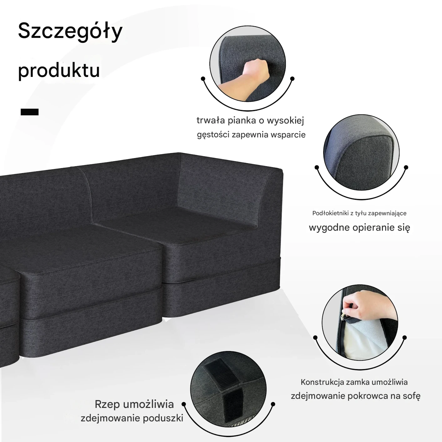 Idealna do mieszkań, akademików i małych przestrzeni. Z łatwością zmienia się w siedzenie podłogowe lub dowolnie się przestawia, dostosowując się do Twoich ewoluujących potrzeb. Całość jest owinięta plamoodporną tkaniną poliestrową, co ułatwia bezwysiłkową konserwację.