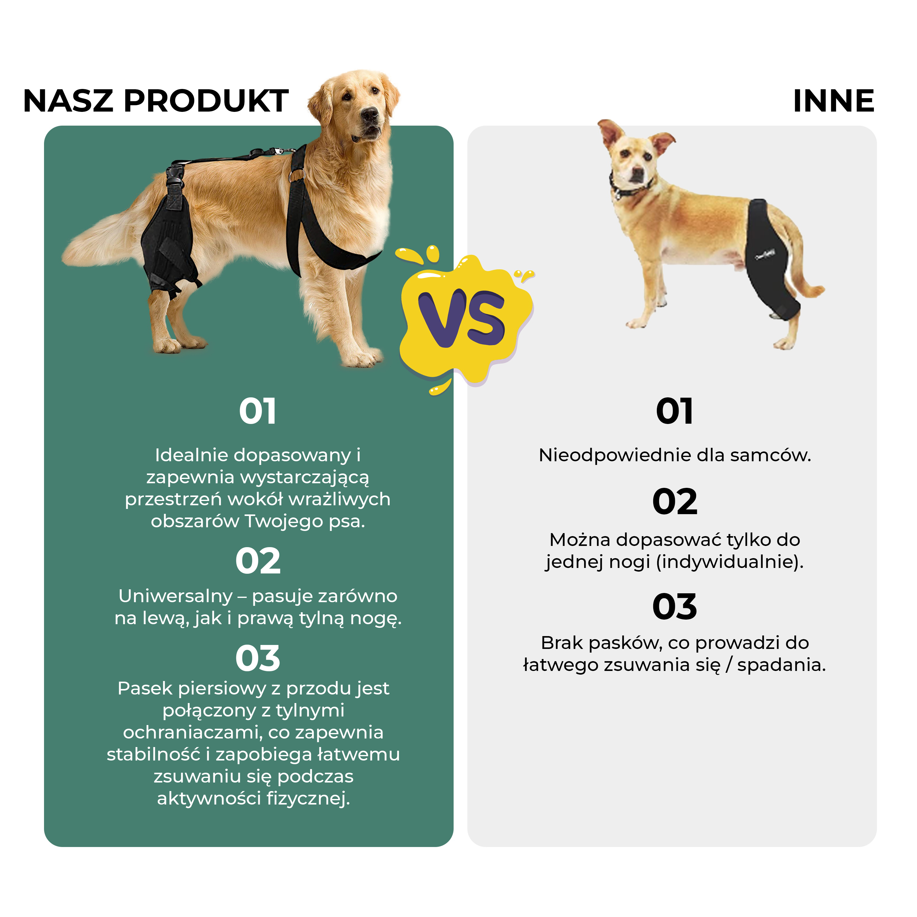 Zapewnij swojemu psu ulgę w bólu i przyspiesz regenerację! Nasza orteza kolanowa gwarantuje wsparcie i stabilizację dla stawów i mięśni. Wyposażona w metalowe stabilizatory sprężynowe, ściśle przylega do stawu, zapewniając ochronę. Wykonana z miękkiego, elastycznego materiału, dopasowuje się do kształtu nogi, gwarantując komfort noszenia. Produkt jest uniwersalny – pasuje zarówno na lewą, jak i prawą tylną nogę. Zapobiega lizaniu ran i wspomaga rekonwalescencję.