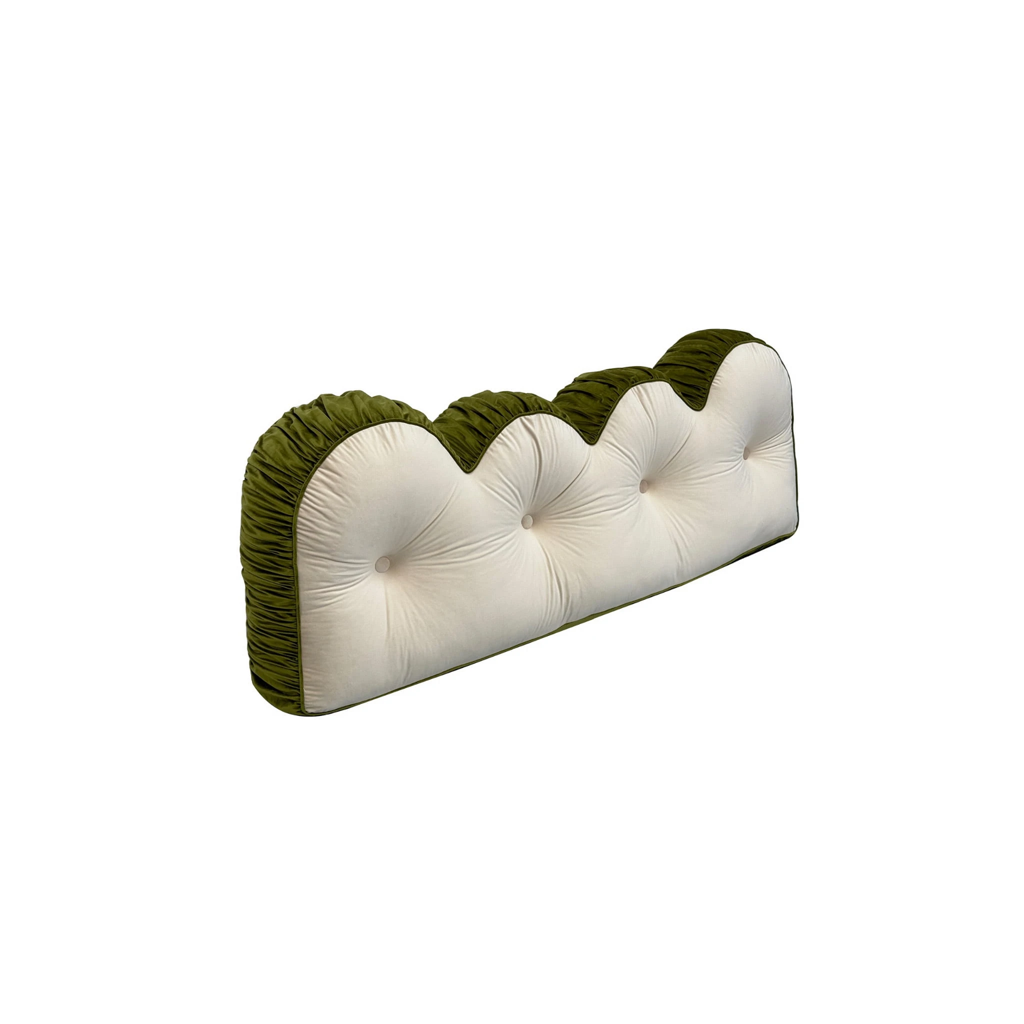 Zagłówek wyróżnia się fantazyjną, falistą linią góry, która przełamuje surowość klasycznych ram łóżek. Zastosowanie kontrastowego połączenia kolorystycznego – głębokiej, oliwkowej zieleni oraz subtelnego kremu – pozwala na łatwe dopasowanie go zarówno do aranżacji w stylu retro, jak i nowoczesnych, minimalistycznych sypialni.